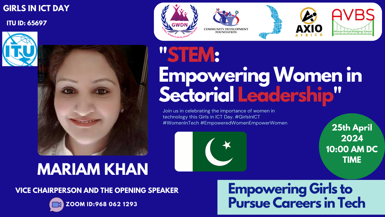 Feeling great Honour to announce consecutive fifth year round 5 of celebrating International Girls in ICT Day event on April 25th, 2024. The theme of this year's event is "Leadership”focusing on empowering young girls in the field of Information and Communication Technology. STEM education plays a crucial role in empowering women and girls by providing them with the knowledge and skills needed to thrive in fields traditionally dominated by men. By encouraging women and girls to pursue STEM subjects, we can promote gender equality, break down stereotypes, and increase diversity in these industries. STEM education opens up a world of opportunities for women and girls, allowing them to contribute to innovation, research, and technological advancements. It helps bridge the gender gap, promotes inclusivity, and empowers women to pursue fulfilling and successful careers in STEM fields. In addition to celebrating International Girls in ICT Day, we will also be launching our project WIFI (Women in ICT Frontier Initiative) at our own in partnership with 5 countries and 5 respective organizations from Pakistan, South Africa, Ghana, Uganda and Bangladesh with a brilliant team of Gudrun Frank Ivy Lawson Tessa Taylor Fozia Ihsan Namyalo Rebecca aimed at bridging the gender gap in the ICT industry and empowering women to excel in this field. We believe that your Presence in this would greatly benefit our young girls aspiring to pursue careers in ICT. Your contribution to this event would be invaluable in inspiring and motivating the next generation of female leaders in technology. We would be honored to have you share your knowledge and experiences online via zoom https://us02web.zoom.us/j/9680621293?omn=82364793683 with us at this important event. Your presence would truly make a difference in the lives of these young girls. Thank you for considering our invitation.