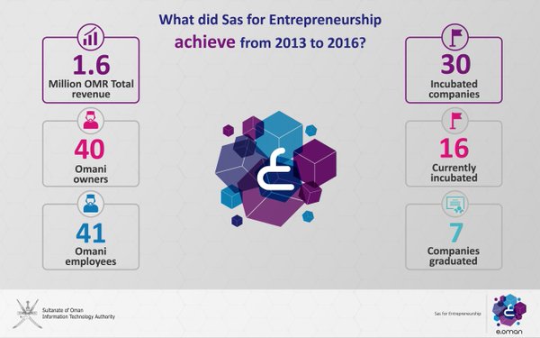 Sas for Entrepreneurship, Sas for Virtual Reality (VR) and Sas Center for Mobile Applications Development initiatives, aim to provide the foundation for creating a new and vibrant ICT industry, thereby fostering an entrepreneurial spirit in the ICT sector in Oman. The program contributes to the development of an internationally competitive ICT industry, self-employment and new job creation, as well as the introduction of new technologies to create innovative products, solutions and services.Today, Sas for Entrepreneurship produced 35 Companies, Sas VR trained 480 Omanies and Sas Center for Mobile Applications Development trained 148 Omanies.