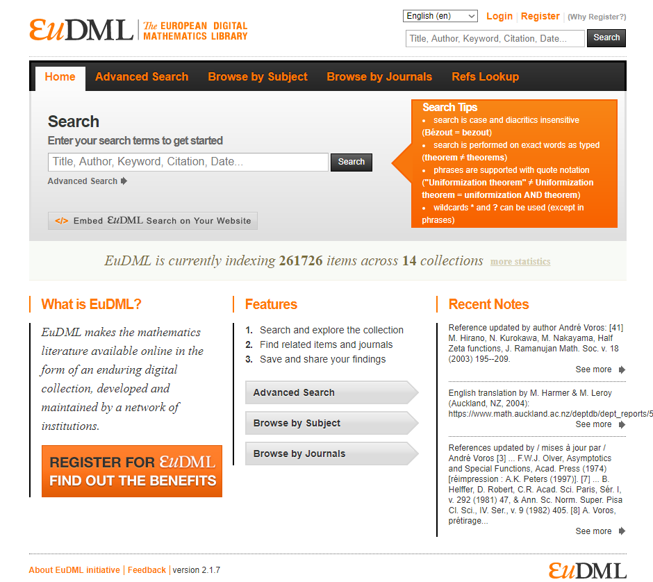 The EuDML Initiative is association without legal personality, formed by a network of universities, public research institutions, publishers, scientific databases administrators and leading technology providers, and further subjects, dedicated to producing quality scientific information in mathematics.Purpose and ObjectivesThe purpose of the Initiative is to provide a Digital Mathematics Library (DML) for the worldwide scientific community as a public service with the aim to help scientists locate the information that is distributed in various digital repositories and discover information related to their work in optimal way, be exhaustive and comprehensive in the field of mathematics.