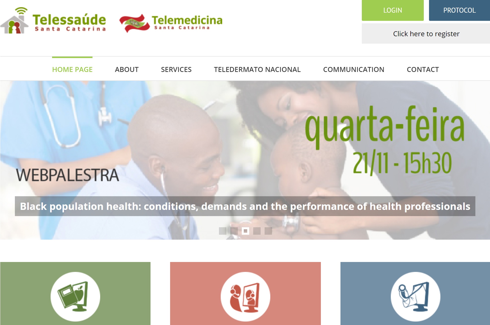 Telessaúde Santa Catarina is part of The National Telehealth Brazil Networks Program, which was established through the Ordinance of the Ministry of Health nº 35 of January 2007, and is coordinated by the Secretariats of Labor and Health Education (SGTES) and Health Care (SAS).It enables the strengthening and improvement of the quality of primary care services in the Unified Health System (SUS), integrating Permanent Health Education (EPS) and health care support through information and communication technologies (ICT) tools and technologies. It is constituted by State, Intermunicipal and Regional Nuclei, that develop and offer specific services for professionals and workers of the SUS.This Program was created in the Ministry of Health in 2007, but in 2005 the State Department of Health (SES-SC) had already begun a proposal for distance examinations with the offer of expert reports, through a Program State called Telemedicine. His proposal was to facilitate the citizen's access to medical examinations of medium and high complexity, starting his pilot with the emission of remote reports for Electrocardiograms and laboratory tests. A digital network was also implemented to facilitate intra-hospital communication for imaging services such as ultrasonography, computed tomography, magnetic resonance imaging, and X-ray. The technological structure of the Telemedicine system was developed by INCoD.
