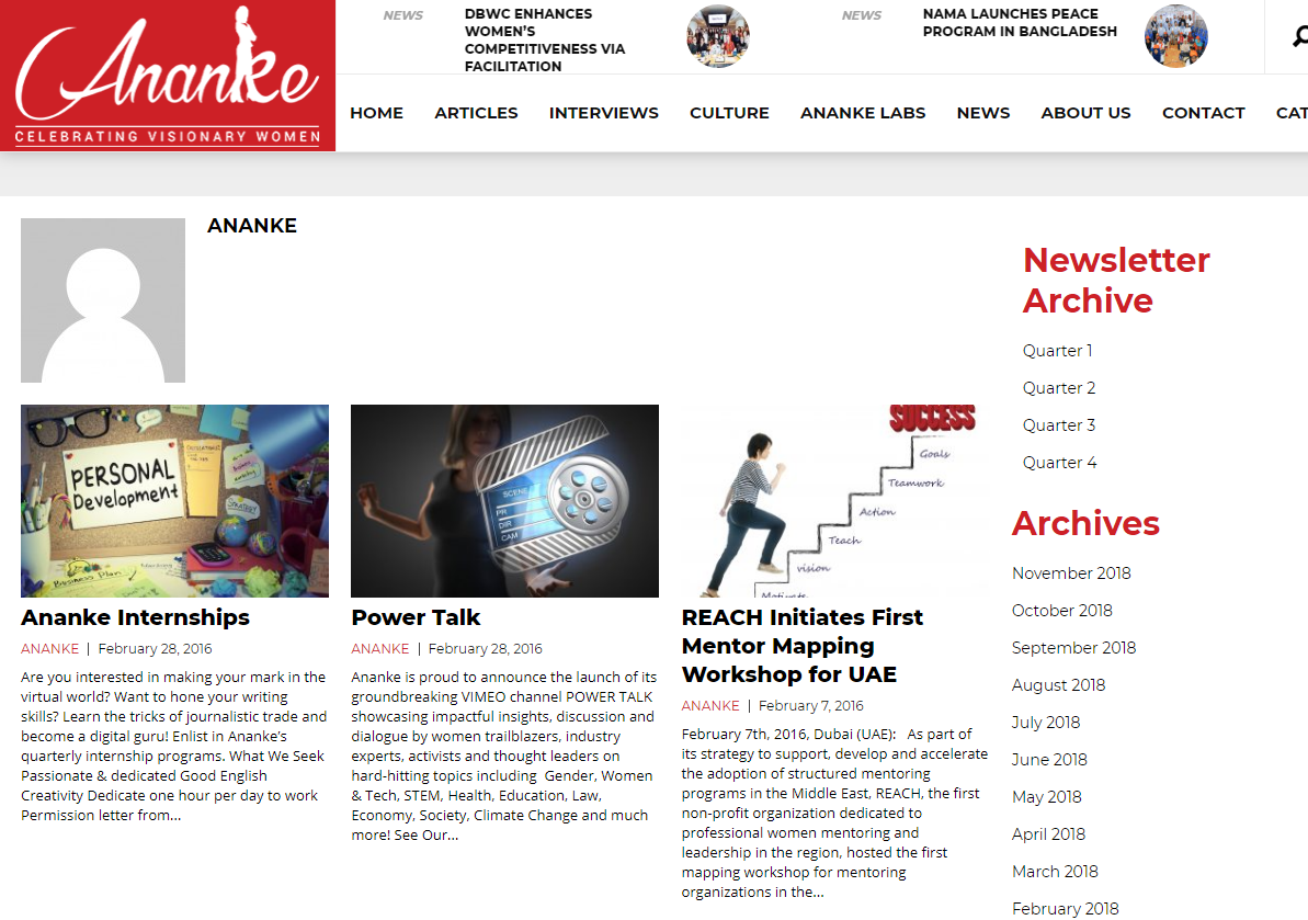 Ananke is a non-profit, online interactive platform engaging women across the MENA region and beyond. The digital publication showcases women trailblazers, visionaries, women in leadership positions as role models for young women seeking inspiration, guidance and mentoring across the globe. Ananke strives to create social impact by advocating empowerment through awareness and education. A platform for knowledge exchange, it aims to empower women through dissemination of information. Ananke's mission is to enable women by documenting their contributions and achievements; thereby increasing awareness of her social issues also boosting her potential.