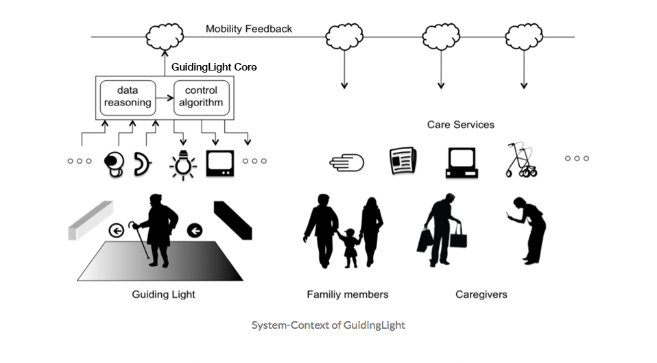 The aim of Guiding Light is to develop, tentatively implement and empirically evaluate an intelligent lighting assistance for maintaining and improving indoor and outdoor mobility of older people at different stages of ageing process and to prepare it for market launch. As far as mobility of elderly is concerned, this goal is to be achieved by enhancing their spatial and temporal orientation by means of lighting way guidance system.