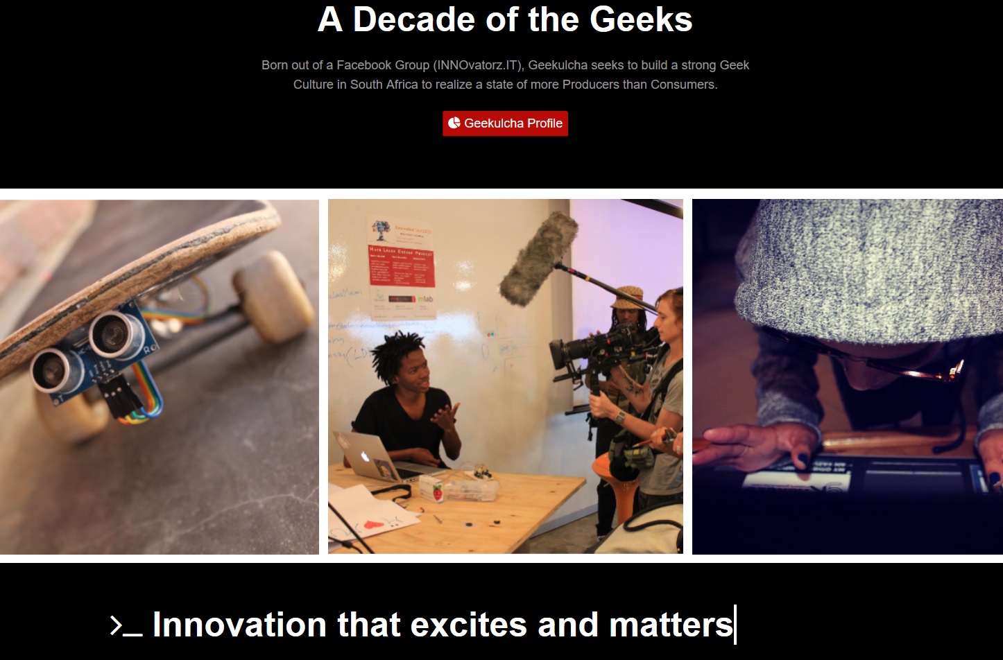 Geekulcha creates and enables platforms for Innovation and Creativity while exposing young talent and skills to the corporate world. Born out of a Facebook Group (INNOvatorz.IT), Geekulcha seeks to build a strong Geek Culture in South Africa to realize a state of more Producers than Consumers. Geekulcha is where the young, skilled, creative and ambitious tech minds meet to connect with each other, share knowledge, collaborate on projects, network with industry leaders, obtain training to further improve and enhance their skills and to put that newly acquired skill to work. The platform has over 9 400 students across Africa.