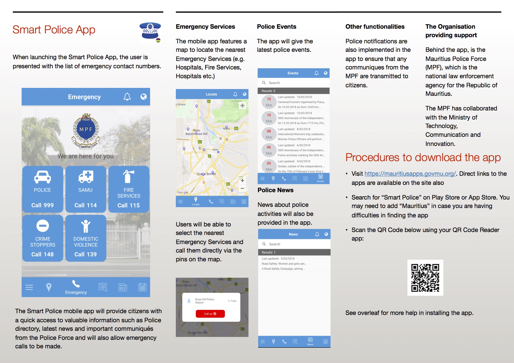 The Smart Police mobile app will provide citizens with a quick access to valuable information such as Police directory, latest news and important communiqués from the Police Force and will also allow emergency calls to be made. It provides a communication channel between the Police Force and the public.On installing the Mobile App on their Smart phones, Citizens will be able to access useful and important information regarding news and contacting the Police Force.Further functionalities may be added in the future for later versions of the MPF Mobile App.