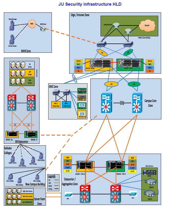 Since Jouf University covers an estimated area of 100,212 km², it is a major challenge to provide and maintain IT services with high availability in a cost effective manner. The main objective of this programme is to implement a new robust network and security infrastructure with high performance and availability in order to provide e-Services for the university staff and students. It consists of several sub-projects.- Core Network which aggregates all university building network and connects all servers.- Local new buildings network.- Local fiber connections between the main DC (Data Center) and the university campus buildings.- Fiber connection between the Main DC and the secondary DC (40 Km).- Wimax connection between the Main DC and the secondary DC (40 Km).- IPVN connections between the Main DC and the university branches in Sakaka (40Km), Tabarjal (250 Km) and Gurayat (400 Km).- Security Infrastructure for securing access to the university e-Services. - Internet connection with redundancy and high availability.Using this infrastructure, the university staff and students can access any services (VDI, Portal, IP telephony, Video Conferencing, eLearning Platform, ERP, …) that enhance the educational environment.