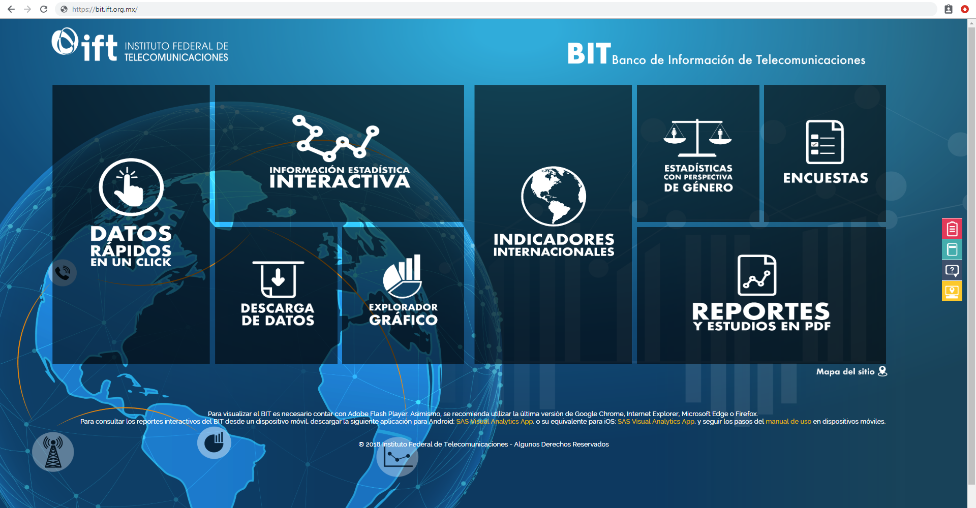 The BIT is a website launched by the Federal Telecommunications Institute (IFT, as per its Spanish acronym) in May 2017. The platform was developed to disseminate the statistical information that the IFT uses to monitor and regulate the Broadcasting and Telecommunication (B&T) sectors in Mexico. In addition, the platform is an interactive web tool that follows international best practices in terms of open data and transparency. Through the BIT, the IFT is aiming the following goals: • Creating knowledge about the Mexican B&T sectors.• Strengthening the decision making process for the industry stakeholders.• Enhancing the creation of public policies aimed to improve Mexican society welfare, through B&T services that are affordable and are provided with quality. The BIT contains indicators of the telecommunications services in Mexico at a national, state, and municipal level. Additionally, it includes key economic indicators for the B&T sectors, telephone number portability, and international comparisons. This tool contributes with goals 9 and 10 of the Sustainable Development Goals (SDG).