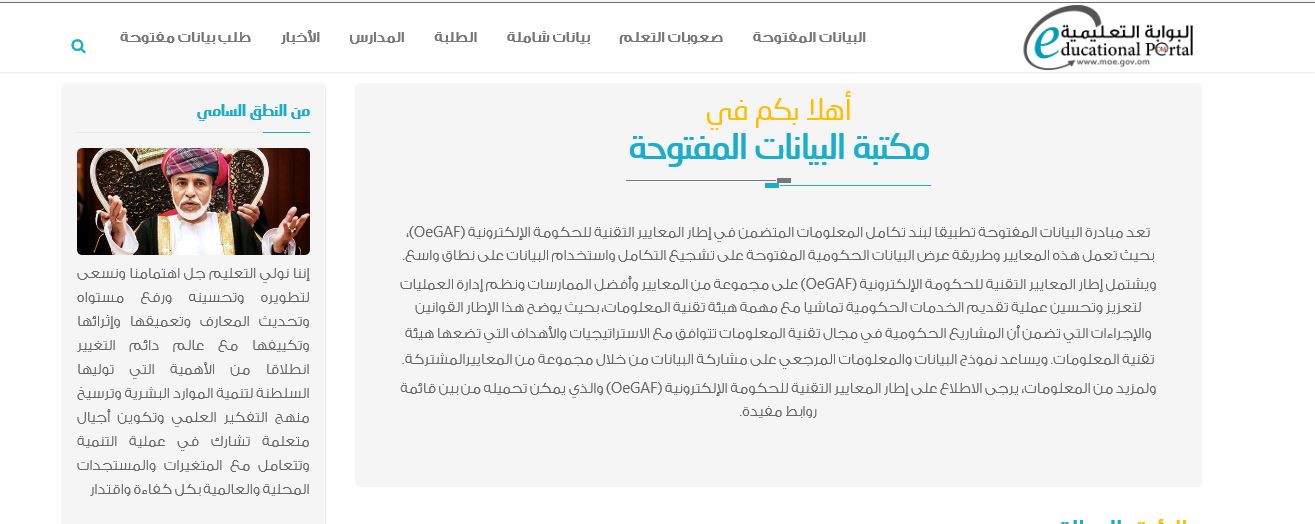 Based on the Ministry of Educations concern with monitoring developments in different educational fields and following an analysis of the educational indicators in line with the sustainable development plans, the Ministry designed Open Data Library at the Oman Educational Portal to provide an enabling provision for proactive and open access to the Ministry data. It offers data of public and private schools, students and classes, teachers and administrators, special education, literacy and adults' education. The data can be freely accessed, reused, modified and shared. It can be also utilized by any organization, such as corporations, universities, NGOs, startups, charities, community groups and individuals.The value of MOE Open Data is to increase collaboration. When MOE provides the Open Data to the public via free electronic download, researchers and developers are quick to develop value-added researches and studies, which in turn fueled education growth in Oman. The MOE Open Data aims to increase transparency. It gives users an informative view of education status, through an analysis of its inputs and outcomes. Also, it contributes in increasing community e-participation for it enables users to follow up as well as to give their feedback about the educational indicators and its development in Oman.