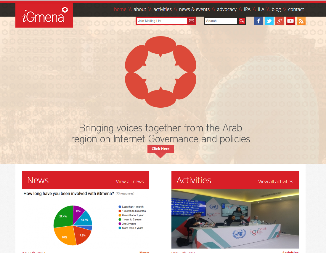 Internet Governance MENA region pogramme is pioneer in : building the capacity of civil society from MENA in Internet Policy through various activities. The programme empowers both women and men to take the lead in pushing Internet policy agenda in their countries and be engaged in the regional policy dialogue at the Arab Internet Governance Forum, and the global discussion. The programme works with the Alumni to develop tools to influence the decision-making process and play an active role in promoting and safeguarding public Interest.