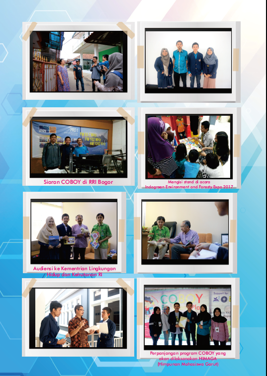 COBOY project is an environment-based education activity for children in Bojong, Pamagersari Village, Bogor Regency through the implementation of alternative learning media as a medium of environmental counseling for children. In addition to game media, the ISBN-listed game guide book is also available to support the sustainability of the COBOY program.In supporting the sustainability of the program in the target location, institutional process has been conducted together with youth leaders and representatives of youth. The results obtained are the existence of environmental hygiene order made by Team COBOY program with community leaders and participants as a form of community commitment in continuing COBOY programs that exist. The order is being attempted to enter as a Village Regulation (Perdes) Pamagersari.As an effort to develop program capacity, COBOY Program has been cooperating with related partners such as Public Relations Bureau of Ministry of Environment and Forestry (KLHK) RI, and Inspirative Teacher IPB Teaching for expansion of program benefits. The various partners appreciate and support the smoothness of the program. Teaching IPB Team has adopted COBOY game media as learning media based on environment education for children to be applied in community service of similar kind. KLHK RI will also adopt COBOY game as a medium of environmental education to children through government program. Then, the COBOY team has also been invited to be a resource person in the KLHK RI climate corner discussion at the National Climate Change Week (PNPI) in early August 2017 as well as introducing COBOY game media within KLHK RI.. We have a plan to expanding this program to another location with accessible through making this game by using digital platform, so that many people arround the world can use this and implemented on their guided area by NGO or something related with