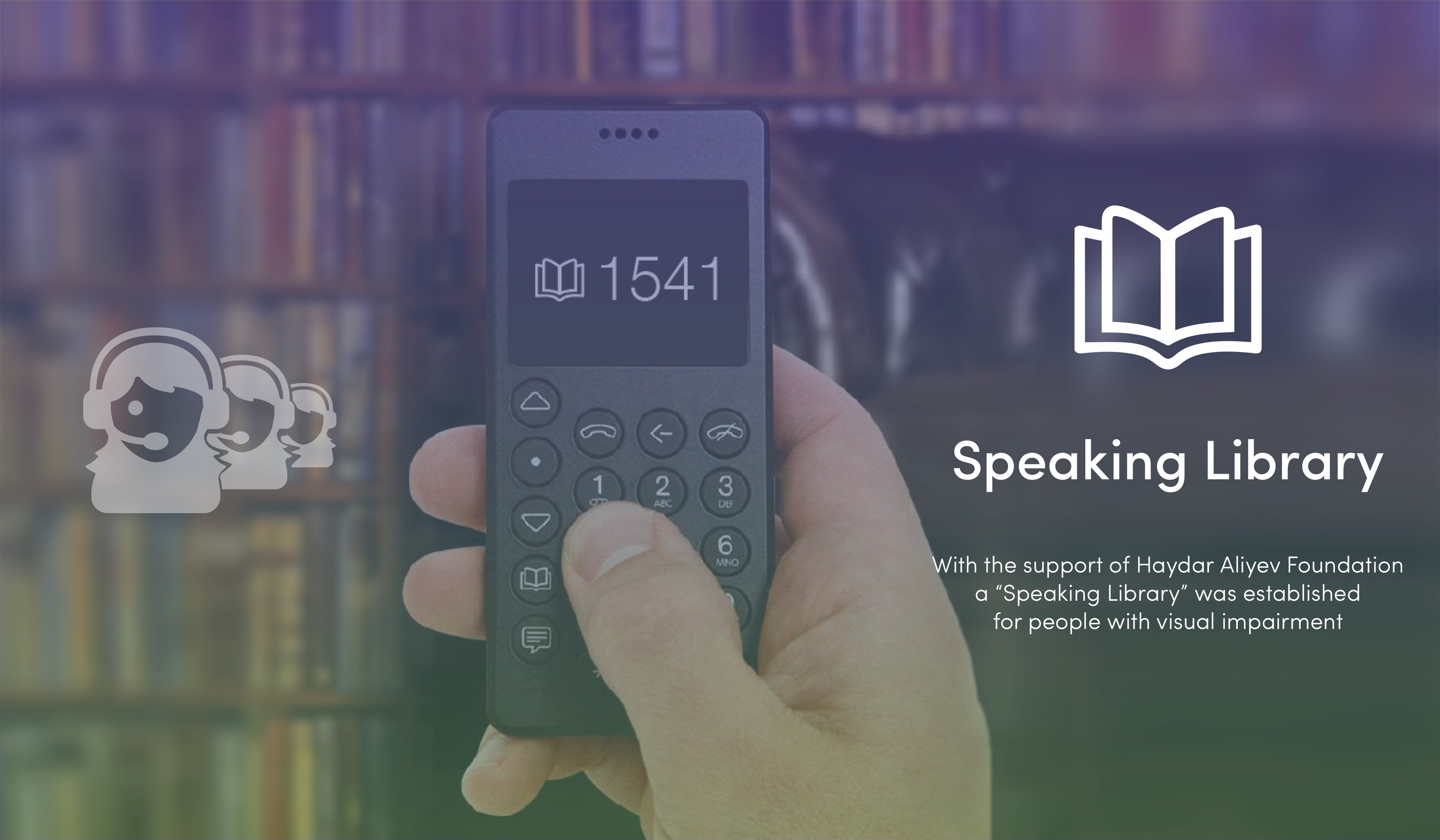 Speaking Library” project provides access of blind and visually impaired people to artistic literature by landline phones without leaving their home. This is completely free-of-charge service and all countrywide local landline/mobile phones have access to it. It is important to dial 1541 to connect to the system, to select the genre, the writer, the works, and listen. You can stop listening to the book any time and after a while , continue listening to it from the place where you stopped.The system has a very simple split of IVR system, as when the call is received, IVR starts playing author’s books once you initially select the genre and the author. For example, you need to choose an appropriate number in order to listen to the literature you want. After selection you can temporarily stop the sound by pushing the “pause” button or playback again from the point where it left off. Besides this, the system also offers the option of resuming from the same point if the same book is selected over the same phone number after hanging up the phone. This modules provide convenient use of the system by users.