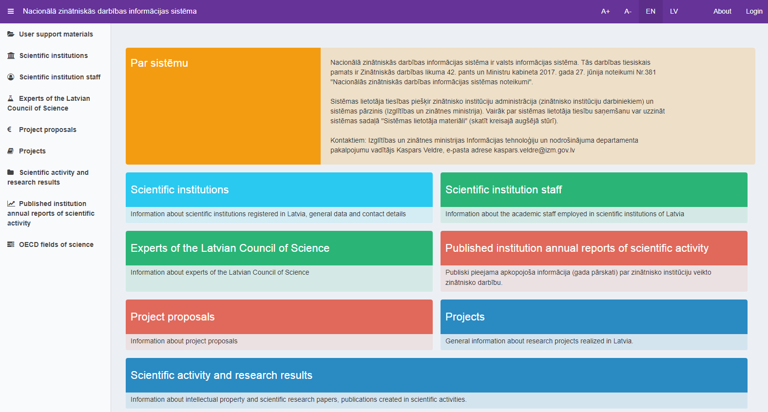 National Research information system (NRIS) is a state information system, which collects data about scientific activity in Latvia from various stakeholders. All scientific institutions (universities, institutes etc.) registered in Latvia report information about their staff, science projects where they participate, and the results of their research (scientific publications, intellectual property and conferences attended), including references to scientific publications available in Open Access. Science funders publish information about new calls for proposals. The Ministry of Education and Science collects statistical data and, using various indicators, calculates public funding which is allocated to scientific institutions based on their staff size, quality and research performance criteria. Scientists submit project applications and apply for expert rights, which are confirmed by Latvian Council of Science. Students and members of the public can use the NRIS as platform where information is collected about the fields of science in which institutions and research groups specialize (except specific personal data and commercial data). This data is publicly available. Although several modules of the system are still under construction, the Latvian scientific community already sees it as a useful tool. NRIS is defined in the Law of Scientific activity, approved by the Parliament of Latvia in December 2016.