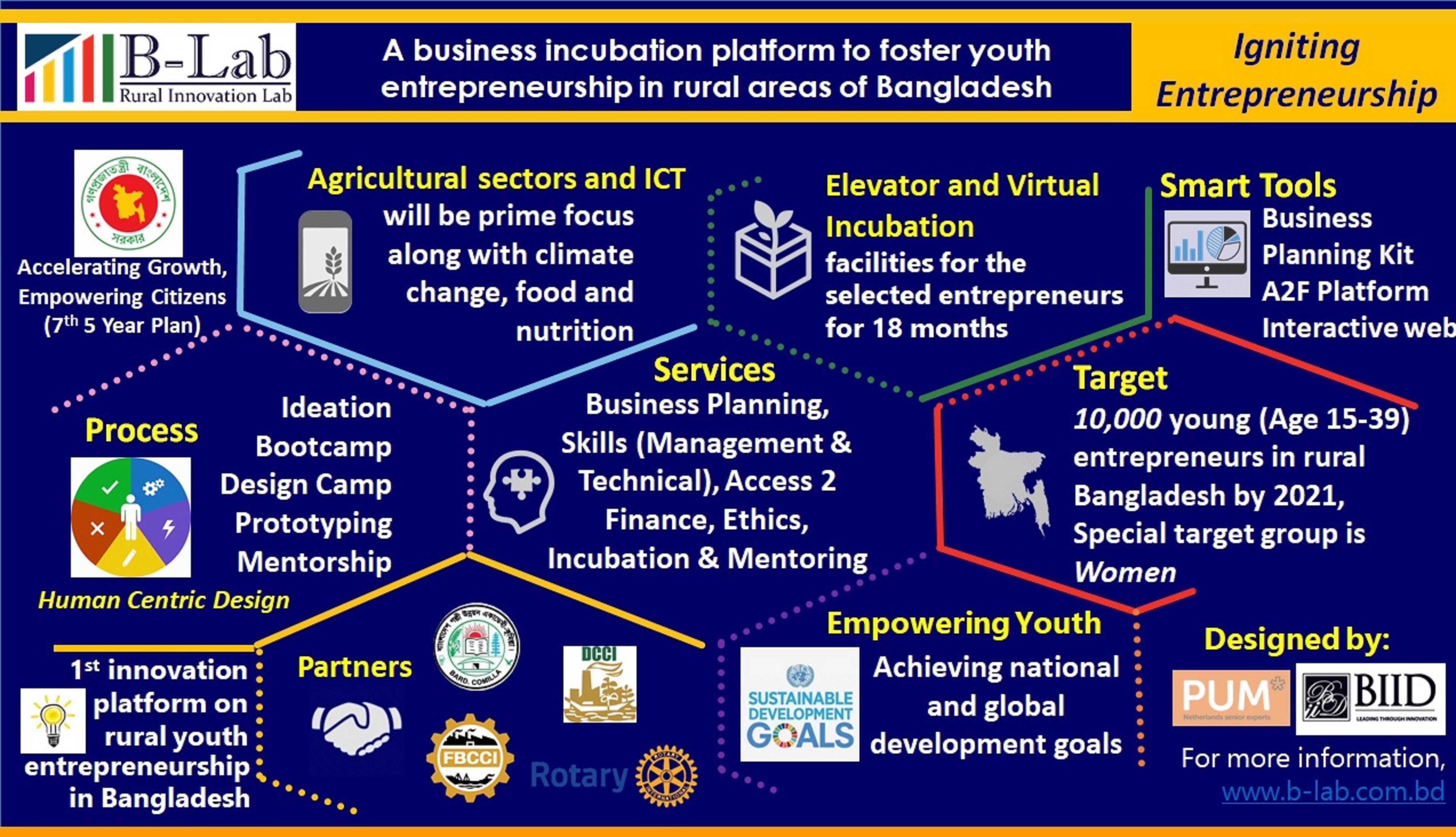 B-Lab (Rural Innovation Lab), an entrepreneurship development platform, is an initiative of Bangladesh Institute of ICT in Development (BIID) designed with support from PUM, The Netherlands to foster entrepreneurship primarily in rural areas of Bangladesh. The theme of B-Lab is Igniting Entrepreneurship. Agricultural sectors and ICT will be prime focus and women will be encouraged with incentives to enroll B-Lab. The platform will offer Elevator and Virtual Incubation facilities for 18 months for the selected entrepreneurs to build their business skills, technical knowledge and compliances. BIID signed MoU with Bangladesh Academy for Rural Development (BARD) and private sector partners will implement the initiative. B-Lab targeted to enroll 10,000 young entrepreneurs around Bangladesh by 2021. Major services of B-Lab comprises Business Idea & Planning, Access 2 Finance and Mentoring. All these will be available in smart tools and accessible via online. B-Lab committed to achieve national and global development agenda, and directly contribute to achieve multiple SDG's by 2030. B-Lab offers partnership to relevant stakeholders in SDG implementation process at national and global level. Resources (Technology, Financial and Non-Financial) can be routed through B-Lab platform to strengthen the entrepreneurship eco-system in rural setup. For more information please visit at www.b-lab.com.bd