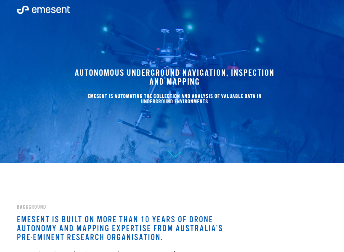 EMESENT IS AUTOMATING THE COLLECTION AND ANALYSIS OF VALUABLE DATA IN UNDERGROUND ENVIRONMENTSEMESENT IS BUILT ON MORE THAN 10 YEARS OF DRONE AUTONOMY AND MAPPING EXPERTISE FROM AUSTRALIA’S PRE-EMINENT RESEARCH ORGANISATION.Our Founders and core technical team were with CSIRO’s Data61 prior to forming Emesent. Having developed Hovermap and experiencing the demand from industry for this technology the founders formed Emesent to bring Hovermap and associated products to market.HOVERMAP - LEADING THE WAY IN UNDERGROUND DRONE AUTONOMYAND MAPPING.Our first product is Hovermap, a LiDAR mapping and autonomy payload which provides a complete solution for inspection and mapping of underground assets such as mines, transport tunnels and utility tunnels. Hovermap has been launched with selected early adopters and will be available in Q4 2018.
