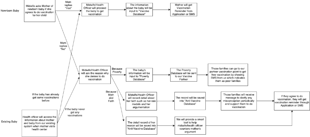 Sahabat Vaksin is a mobile application that aims to provide public information to support willingness and timeliness in vaccinations in the community, while helping health workers and people of influence in the community increase their competence and confidence in countering anti vaccine narratives. This idea is aimed to counter the impact of the spread of anti vaccination narratives that has been exarcebated by high use of social media and low media literacy rates. Indonesia in particular is prone to this issue, with a high rate of community members spreading and believing in “hoaxes” and low media literacy rates, with vaccine rejections based on religious misconceptions/perceptions being a key factor. Sahabat Vaksin works by engaging 3 main stakeholders (i) it equips midwives with adaptive counter messages (driven by machine learning) to help clarify misconceptions in anti-vaccination arguments, focusing on both health based as well as religious based counter arguments, (ii) it gives mothers customized, timely messages based on pregnancy stage or child age and perception towards vaccination through USSD messaging and multiple social media channels, and (iii) it engages local religious leaders and actors to develop and spread their narrative in supporting timely vaccination, including equipping them with appropriate medical and technical knowledge. The project currently just finished its first major prototype and will be tested in at least 3 major municipalities in Indonesia throughout 2019.