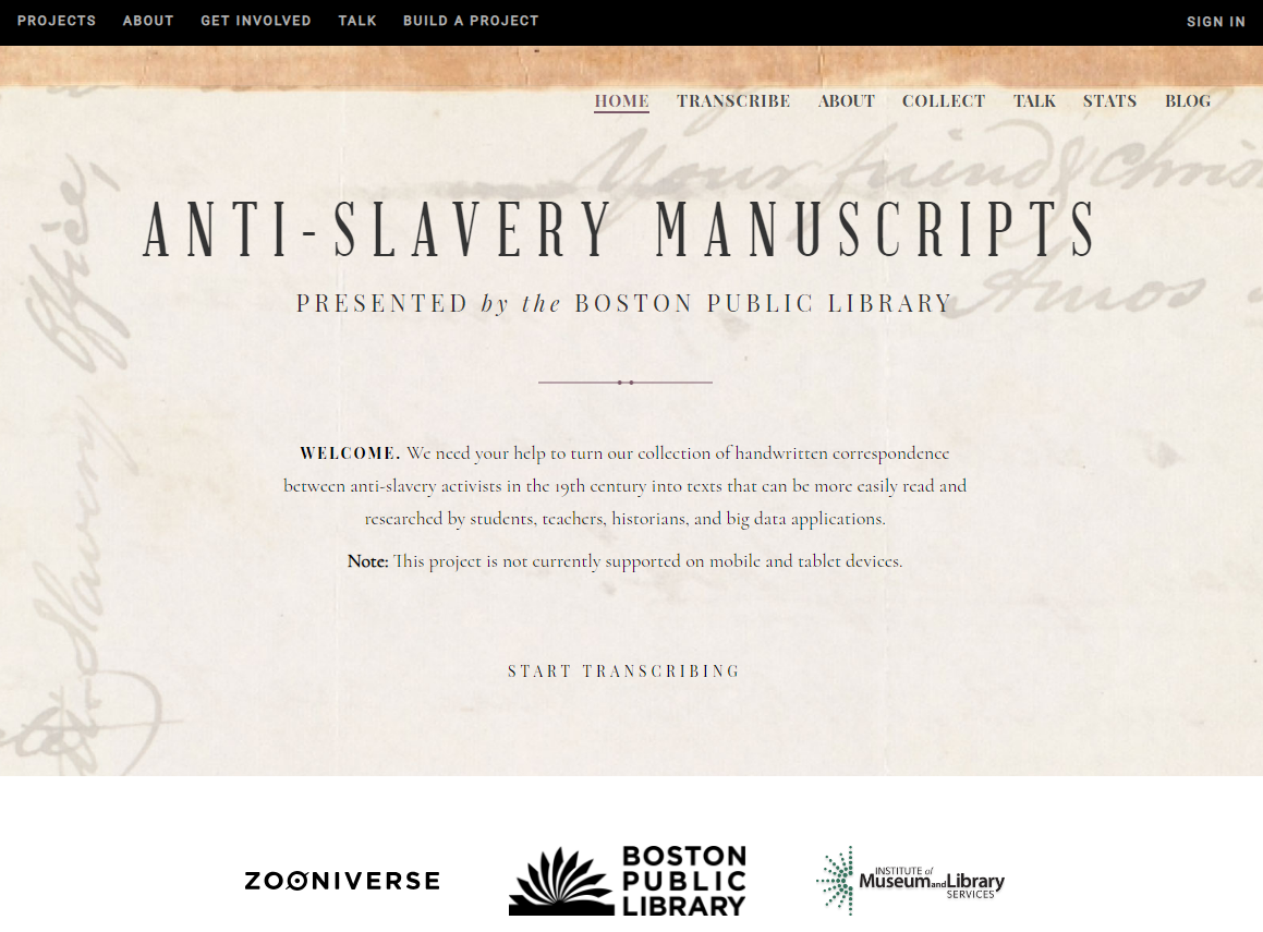 The Boston Public Library's Anti-Slavery collection—one of the largest and most important collections of abolitionist material in the United States—contains roughly 40,000 pieces of correspondence, broadsides, newspapers, pamphlets, books, and memorabilia from the 1830s through the 1870s.The primary production goal of this project is to gain a complete corpus of machine-readable text from these handwritten documents. There are no software programs that can accurately convert handwriting into characters that a computer can understand as an actual letter, number, or symbol. Once the documents have all been transcribed and converted into this machine-readable text, we will upload the text into ourrepository systemand index them along with their corresponding image files. Users will then be able to search the full text of the letters across the entire collection.We also plan to make the transcriptions available as a complete, open access data set, with the intention that the corpus will be exposed to machine learning, topic modeling, and other natural language processing and computer visualization applications.