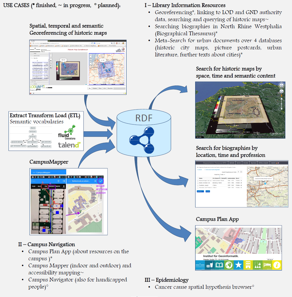 The overall goal of the project is to improve interdisciplinary collaboration in research and education through the sharing of scientific data organized in space, time and semantics. The project addresses various kinds of resources, ranging from project- and user-generated data, through articles and books to historic maps. Exposed as Linked Data, these resources feed eScience services to discover, access, and enrich them and to use them in scientific and other knowledge infrastructures. The project aims at overcoming the information silos that dominate libraries and research respositories. It builds on standards, such as those of the Open Geospatial Consortium (OGC), and extends them by Linked Data interfaces, targeting a better integration of bibliographic, scientific and administrative contents. This approach enables a retrieval of contents through spatio-temporal and semantic queries (e.g., “books about medieval Westphalia”, “politicians from the industrial period which were born in Berlin”, “borders of Prussia in 1830”).The project produces tools and workflows for data publishing across domains as well as insights regarding the requirements and benefits of heterogeneous datasets for eScience. The results enter and expand standard library workflows, supporting their maintenance. In particular, we develop:extract, transform, and load (ETL) processes for linked spatio-temporal data;annotation workflows and tools (clients to describe and enrich information resources);interfaces serving linked spatio-temporal data to standard clients (including services for spatial data and maps); andspatio-temporal retrieval and search tools.