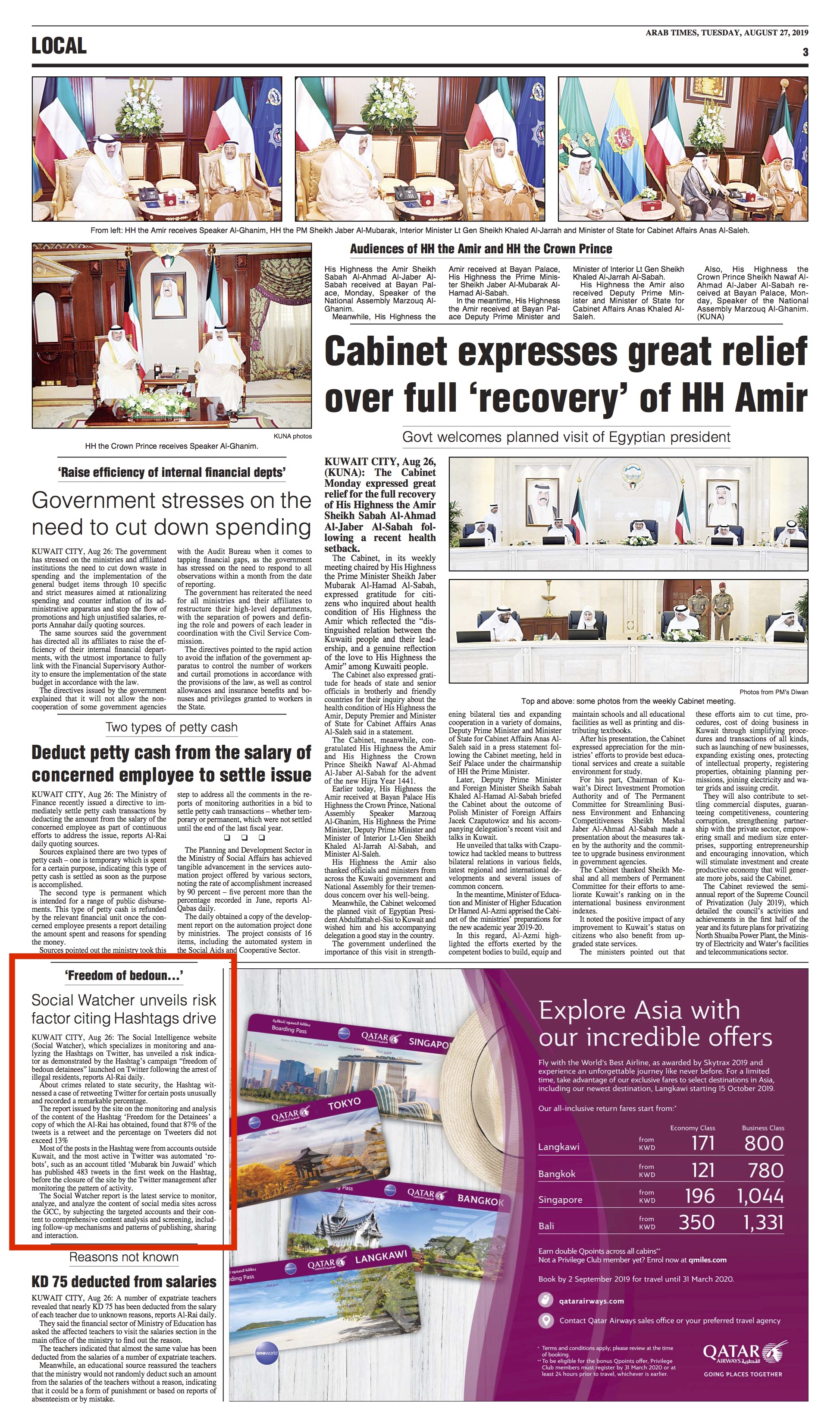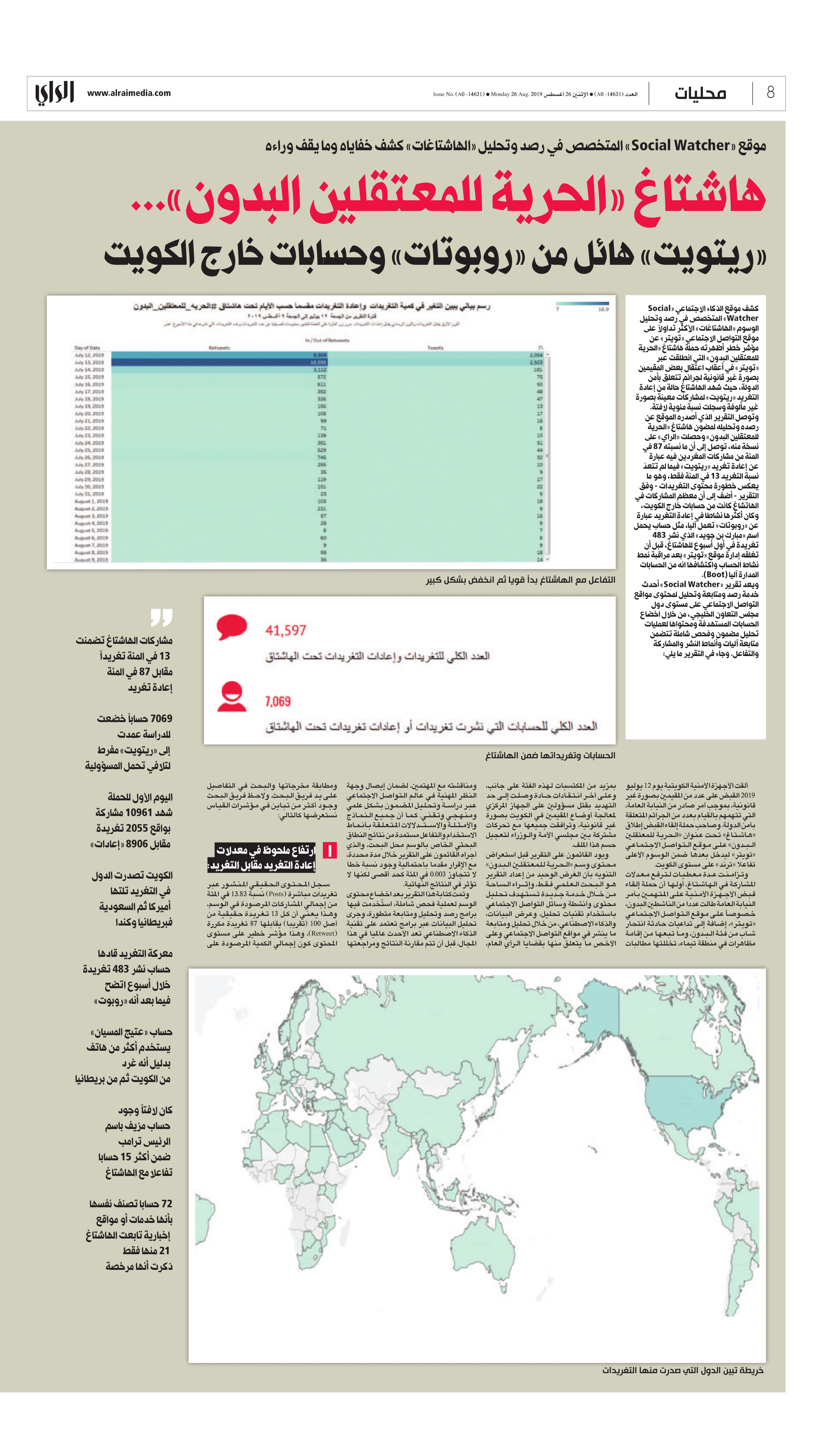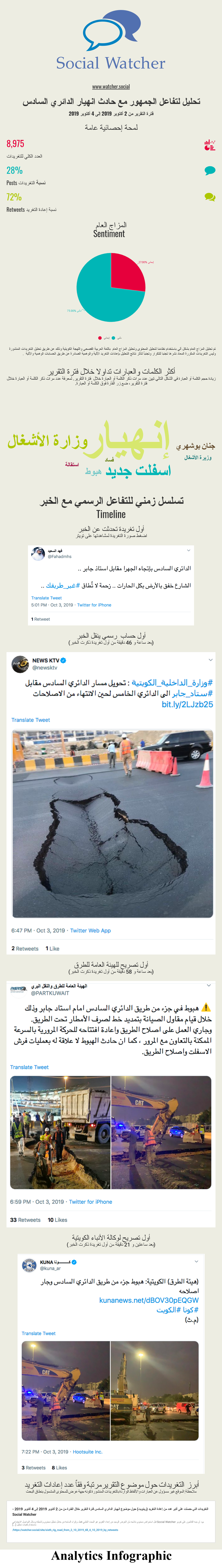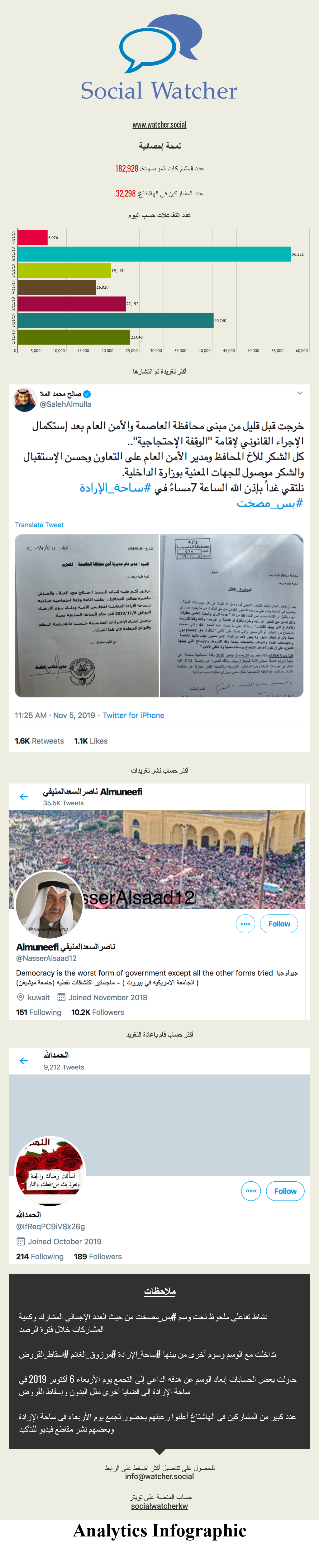 Social Watcher is a large-scale community service which utilizes media and ICT tools and expertise. The service utilizes Artificial Intelligence, Text Mining, Big Data analytics and visualization, and Natural Language Processing to analyze the public opinion regarding political and social issues in Kuwait and study the impact of those political and social issues on the Kuwaiti society. Through this analysis, our platform monitors content and activities on social media in Kuwait, identify and analyze public opinion trends, analyze public sentiment, and finally delivers analytics reports, infographics, and interactive dashboards showing the results of our analysis in an open, transparent, objective , and scientifically motivated manner. The analytics reports are published on our mobile friendly web platform, social media, local media and circulated among interested professionals.In addition, Social Watcher web platform allows the public users to view trending Twitter tweets, hashtags, media, and images in Kuwait for the last 24 hours (data are automatically updated every 24 hours) . In this respect, Social Watcher utilize an application (Social Intelligence) developed by Information Age Consulting (one of the two partners participating in Social Watcher project). The application of Twitter trends utilizes Trendsmap API to collect trending Twitter data for Kuwait. Kuwait Twitter Trends section on Social Watcher web platform, which is available as an open access tool, allows the audience to understand the current trends in Kuwait on Twitter in a dynamic and constantly updated manner.The analytical reports, infographics, and dashboards published on Social Watcher web platform provide an effective tool for the decision makers, media professionals, political analysis, and the public which helps them in understanding public opinion trends and sentiment on social media towards political and economic issues in Kuwait and the change in these trends within a specific timeframe.