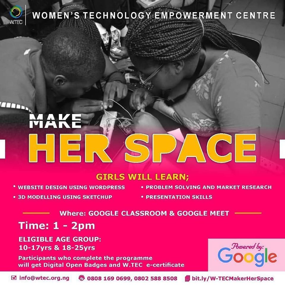 MakeHer Space project is an initiative by W.TEC, designed to teach girls to create technology and engineering-based solutions that solve problems in their communities, provide information about career options and exposes them to women working successfully in STEAM. Objectives:•Teach the students to create technology and engineering-based solutions that solve problems in their communities.•Help the young women hone their abilities to work in teams, as they will work in teams on technology and engineering-centered projects•Help the young women develop marketable and practical skills in and an appreciation of technology, art design, engineering, maths and critical thinking.•Connect the girls with and prepare them for further education and career opportunities in STEAM and/or entrepreneurship.The project was initially planned to run as a face to face programme but was transformed to run in an online setting due to the outbreak of the COVID-19 pandemic. The pilot programme which ran from May till November 2020 saw 88 girls through intensive training on Website Design, 3D Modelling, Video Marketing and Market Research and Analysis. Training held in 6 cohorts, 4 times a week with wonderful success stories from participants.