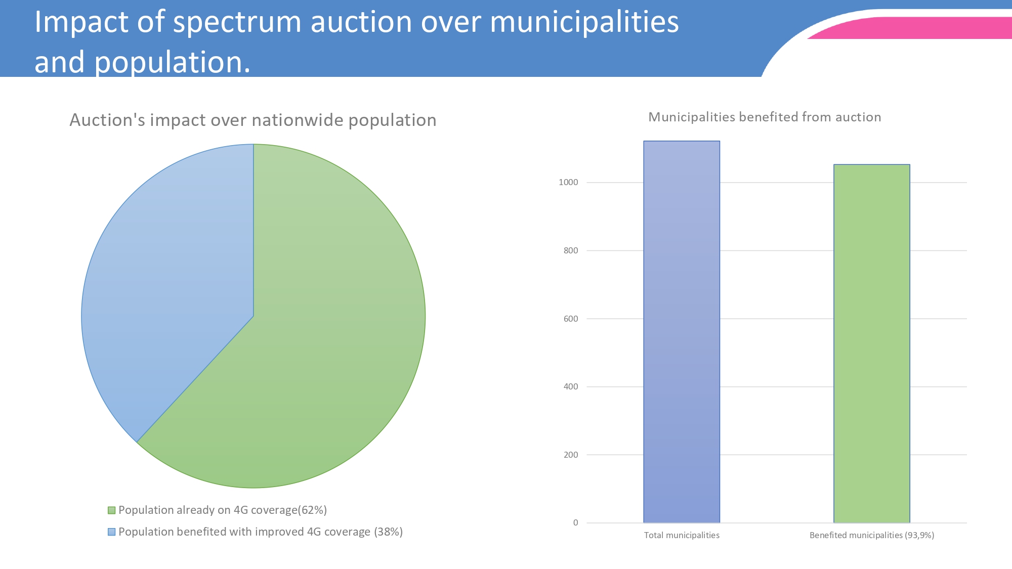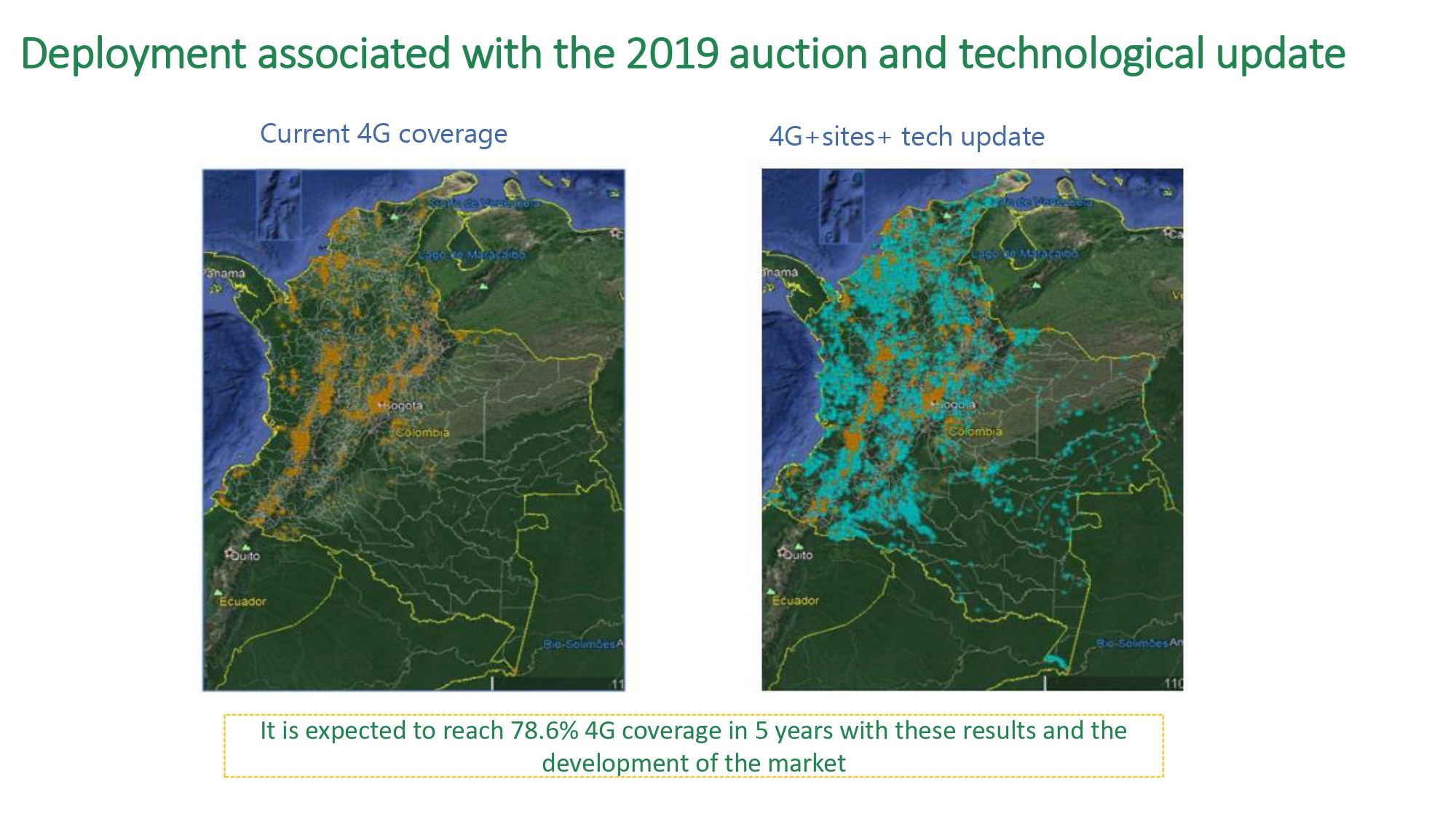 In December 2019 Colombia held a pivotal spectrum auction with 4 main objectives: i) increase coverage in rural and remote areas; ii) improve quality of service for 4G services across the country; iii) foster investment and competition among mobile operators; and iv) increase the income towards the FUTIC (universal access fund). The auction achieved an unprecedented milestone in terms of social inclusion and rural coverage: 3,658 rural communities will benefit from new 4G coverage in 5 years. This will lead to a dramatic leap from 7,9% rural 4G coverage to almost 80% before 2025, resulting in most inhabitants of Colombia´s rural areas benefiting from ICT for the first time. Furthermore, it also established a modernization obligation for existing operators of upgrading 2G and 3G networks to 4G over 4 years in municipalities with populations of under 100,000 inhabitants, representing 90% of Colombia’s municipalities. This auction has no precedents in terms of social and geographical impact as well as the expected performance from the networks, benefiting most Colombians with high speed mobile broadband at more affordable prices.