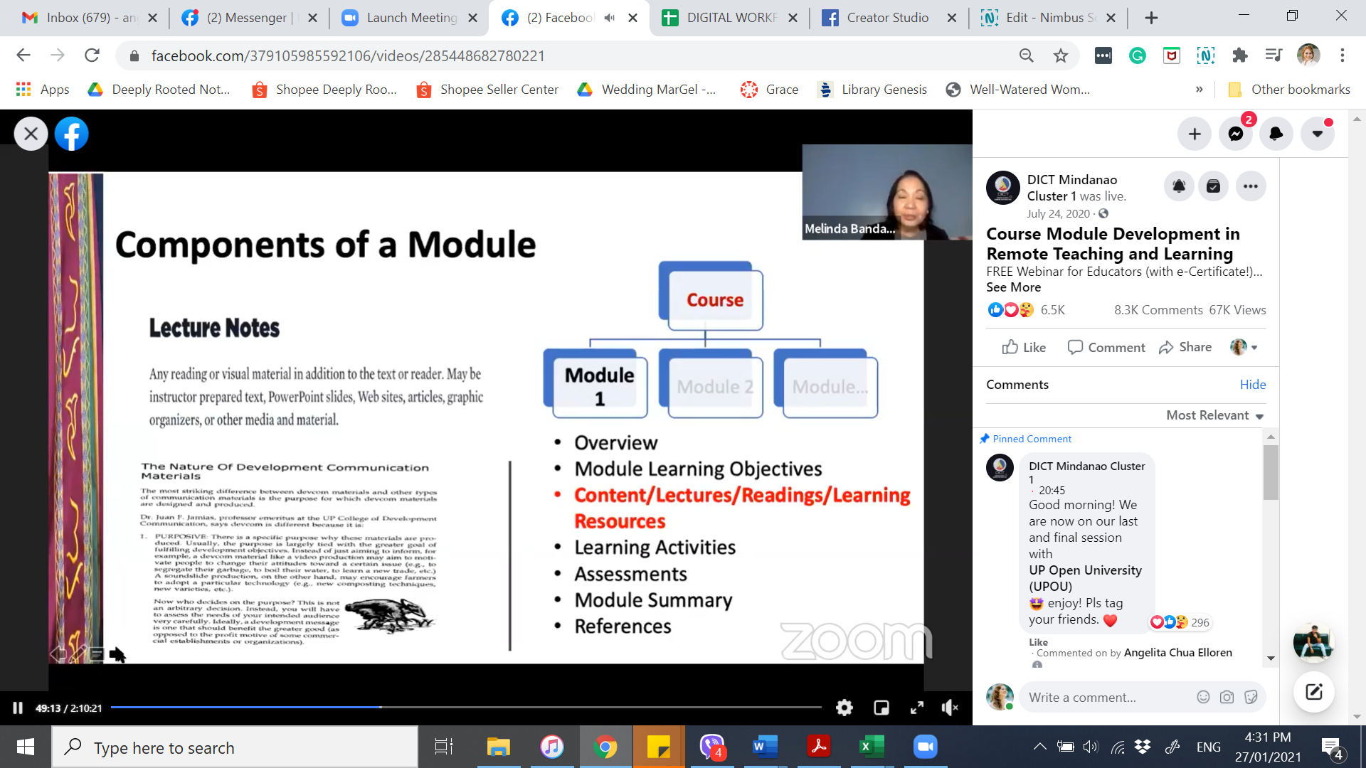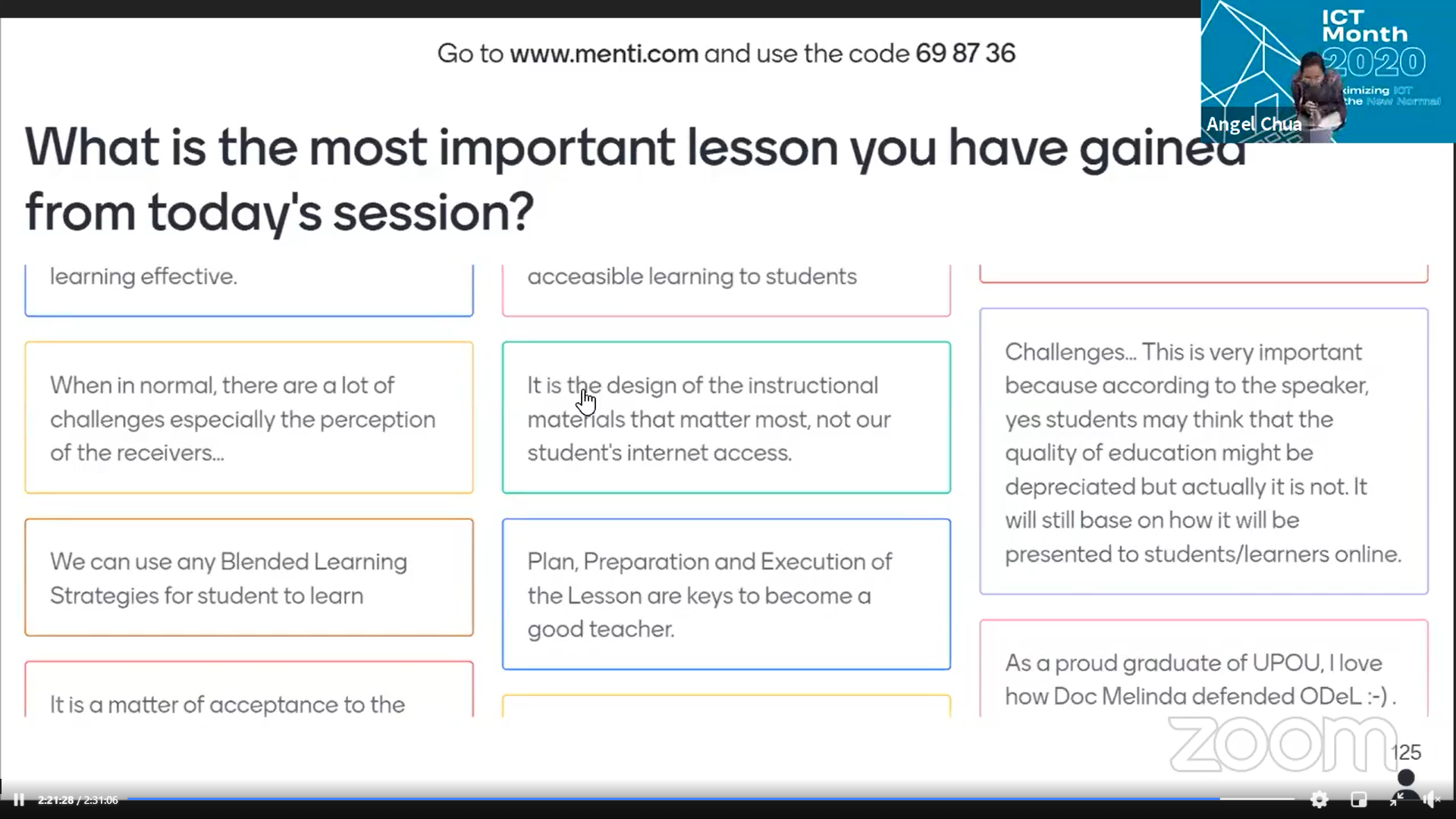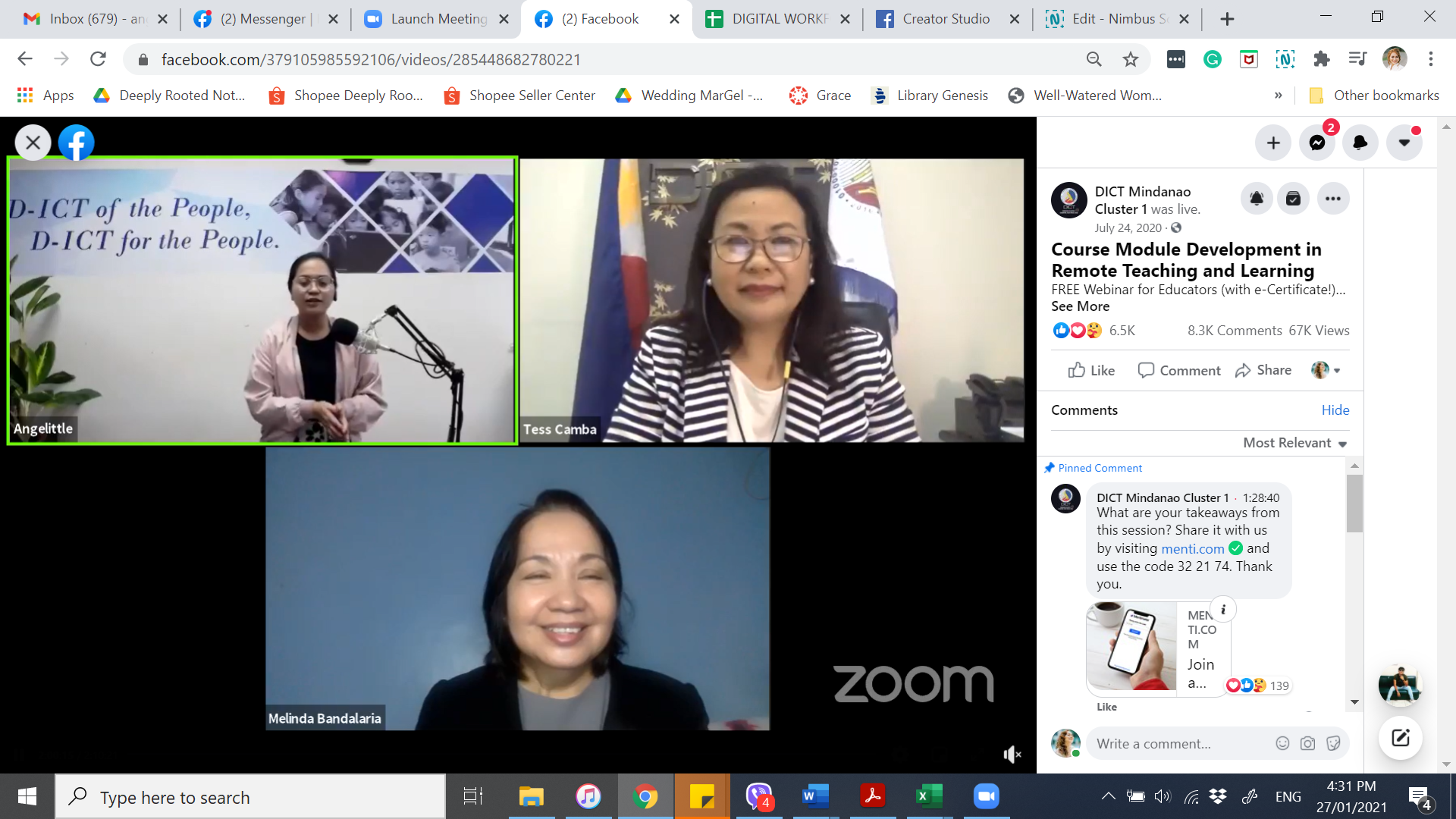 The training design makes use of Internet as the venue for training and learning, on-demand sessions are available and accessible anytime at DICT MC1’s Facebook page (www.facebook.com/dict.mc1) for those who would need or want to study the topics - a model for continuing education or lifelong learning which is critical especially among educators. Since the training materials had been released as Open Educational Resources through the DICT’s repository, continuous use can be assured.