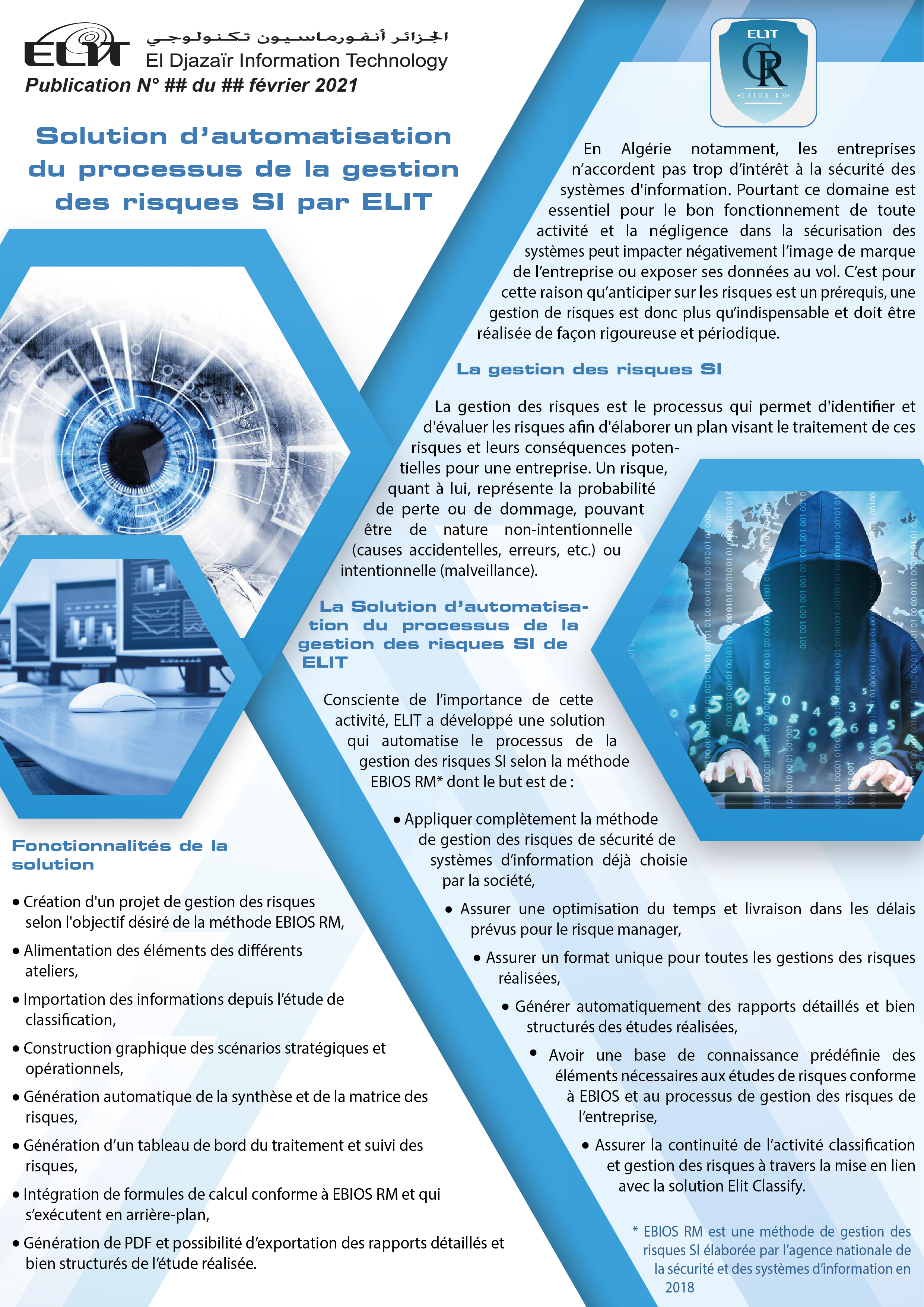 Risk management is the process of identifying and assessing risks in order to develop a plan to address those risks and their potential consequences for a business. A risk represents the probability of loss or damage, which may be of an unintentional nature (accidental causes, errors, etc.) or intentional (malicious intent).Aware of the importance of this activity, ELIT has developed a solution that automates the process of IT risk management according to the EBIOS RM method. The purpose of this application is to:• Completely apply the information system security risk management method already chosen by the company• Ensure optimization of time and delivery on schedule for the risk manager• Ensure a single format for all risk management carried out;• Automatically generate detailed and well-structured reports of the studies carried out• Have a predefined knowledge base of the elements necessary for risk studies in accordance with EBIOS and the company's risk management process,*EBIOS RM is an IT risk management method developed in 2018 by the French information system security agency ”ANSSI” .