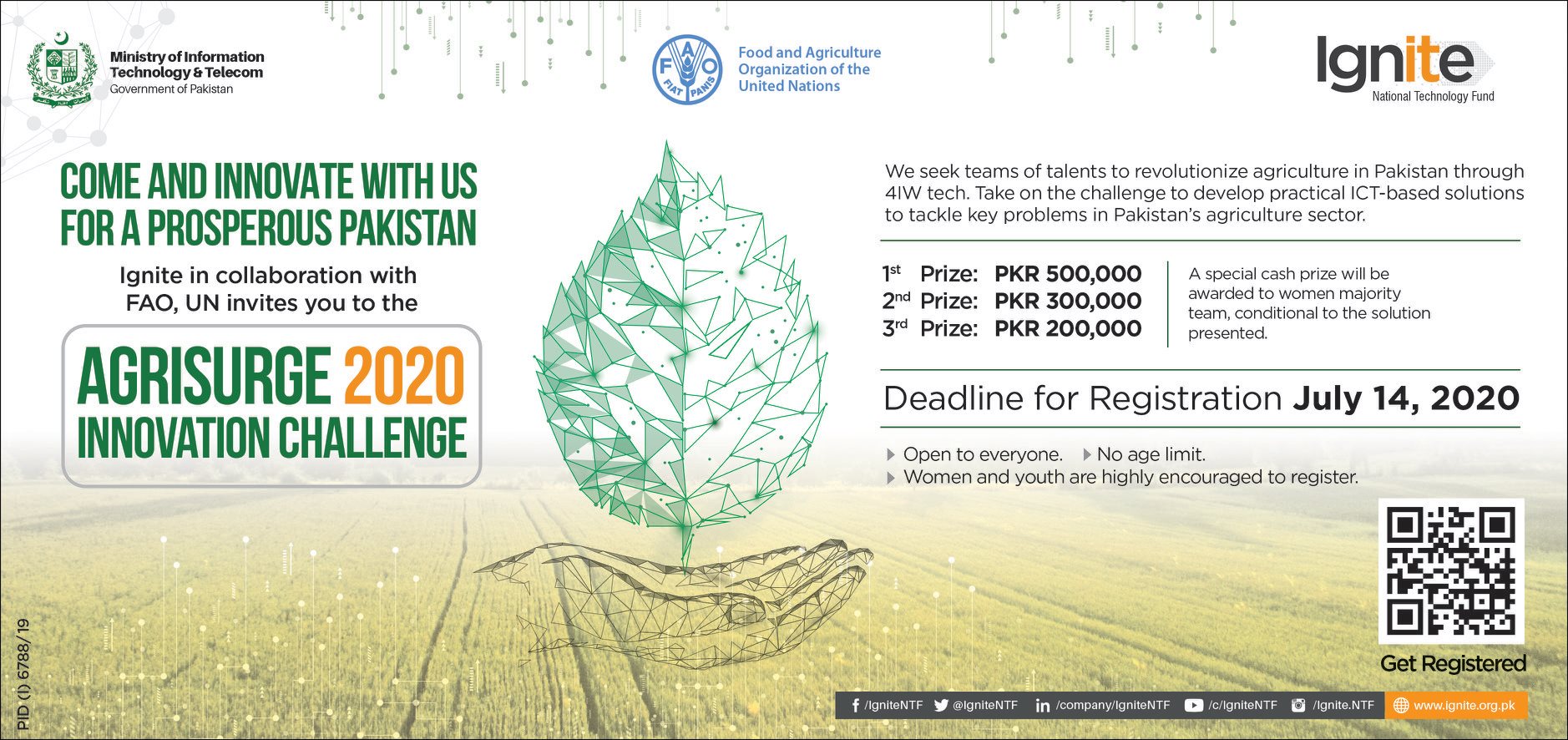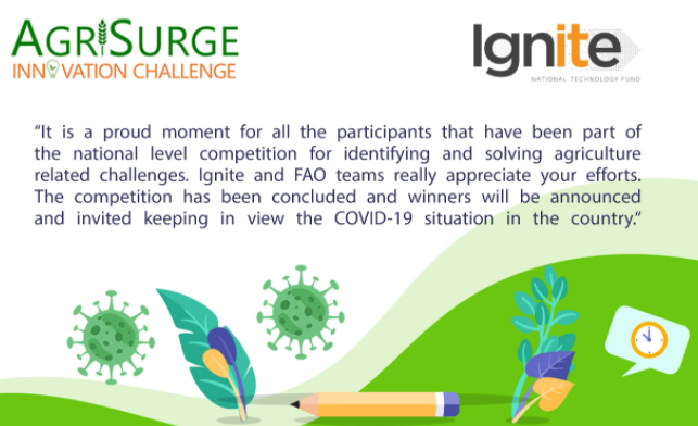 Ministry of Information Technology and Telecom (MoIT) along with the Food and Agriculture Organization of UN (FAO) launched a national call for industry 4.0 centric solutions that address the current challenges being faced by the agriculture sector in Pakistan including water shortage, food security, nutrition and others. The AgriSurge Innovation Challenge (AIC) is an Open Innovation Challenge seeking to transform agriculture sector in the country through groundbreaking ideas to meet the growing challenges with new solutions submitted by inspiring individuals and teams – of students, professionals, entrepreneurs, startups, and ordinary citizen innovators. AIC aims to ignite innovation to enhance the agricultural productivity of the country using 4IR technologies of AI and Big Data to help feed the growing population. The objective of the AIC is to support the brilliant ideas from the talented innovators by providing them conducive environment and resources including funding, mentorship, incubation and etc. to make agriculture development more rapid, more inclusive, and more resilient.