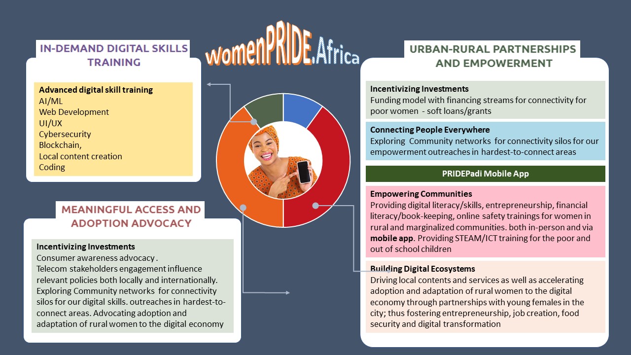 Women Pivoting Resilience In the Digital Economy in Africa (WomenPRIDE.Africa) is an initiative of Women in Technology in Nigeria(WITIN) which equips women and girls to thrive in the digital economy via three pivotal pillars: In-demand digital skills training; urban-rural partnerships & empowerment; and meaningful access and adoption advocacy. A five-year action plan(2020 – 2025) in partnership with the ITU Girls in ICT and Partner2Connect coalition. In 2020 pilot for young women and girls, 120 participants adversely impacted by the COVID lockdown were trained on starting up small businesses as front-end developers, who began to build websites immediately after the training. In 2021 pilot for rural women, the initiative sensitized and surveyed face-to-face 1200 under-connected and unconnected marginalized women who live in digitally disadvantaged communities across the six geopolitical zones in Nigeria; for rural-urban partnerships and empowerment. WITIN also works closely with telecom regulators for consumer awareness advocacy as well as engage stakeholders to influence relevant policies both locally and internationally. This initiative would immensely eradicate hunger and poverty while bridging the digital gender divide in Africa.