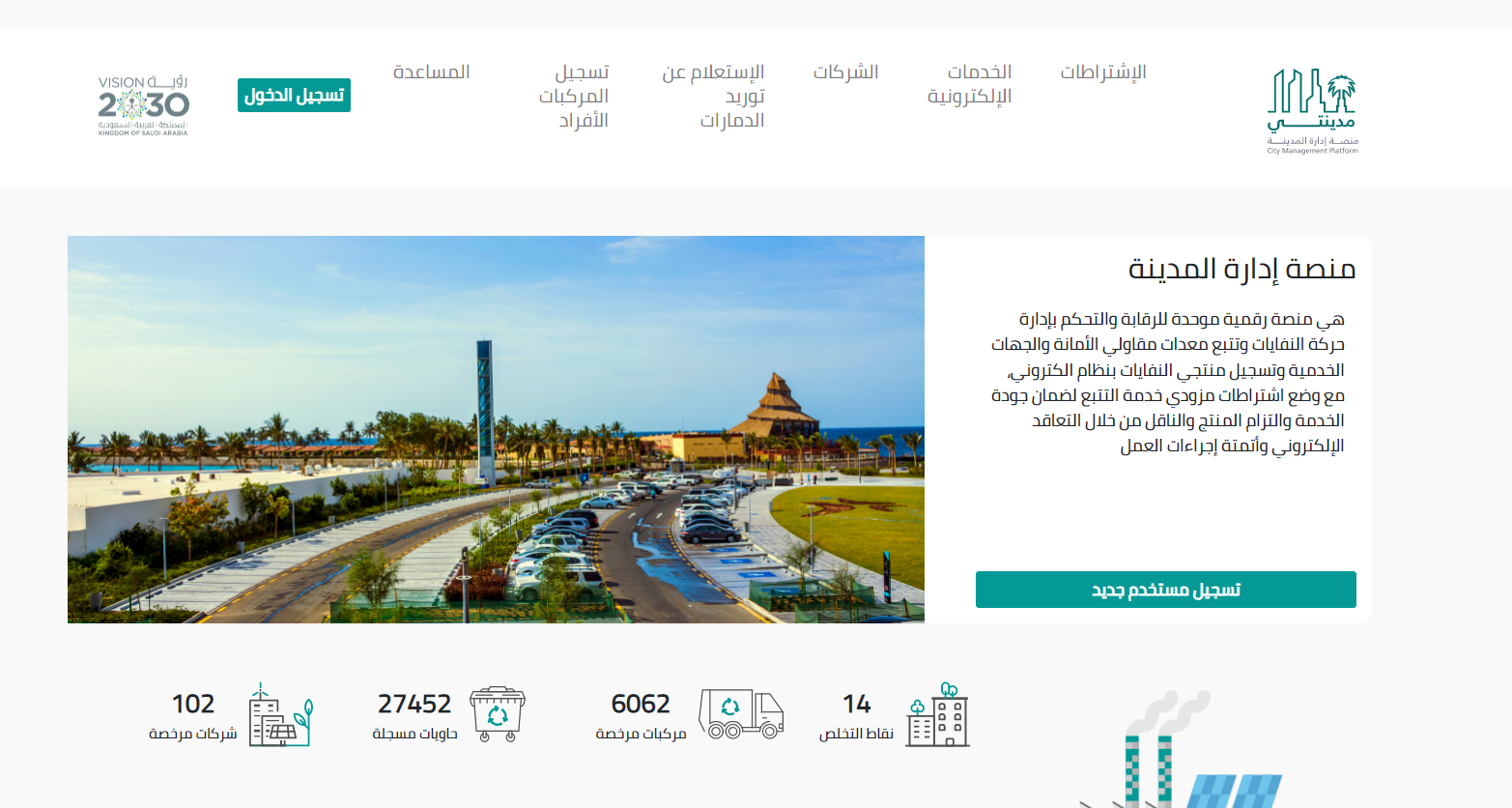 Madinati is a unified digital platform for monitoring and controlling the management of waste movement (B2B), tracking the equipment of municipality contractors and service agencies, and registering waste producers in an electronic system, with setting requirements for tracking service providers to ensure quality of service and commitment of the product and carrier through electronic contracting and automation of work procedures. Among the types of waste and their classification: household waste, demolition and construction waste, ready-mixed concrete, treated medical waste, sewage, commercial waste, hazardous medical waste, and recyclable waste.Madinati Platform helps the municipalities' entities to introduce accountabilities on the municipal waste generators in all sectors against the waste they produce. It consists of a very robust core platform, which changes dramatically the operational efficiency of the business processes and helps in building a comprehensive knowledgebase with much higher accuracy to support strategical decision making. Madinati platform project aims to Monitor, control and manage waste movement form its sources ,Monitor vehicles, and equipment of the municipalities projects, and cities infrastructure projects, manage registration of waste producers in smart electronic system, Unifying the requirements of tracking service providers according to the highest technical standards. ,Ensure the quality of service, and compliance through electronic contract documentation, and automation work procedures in line with the objectives of the MOMRAH.