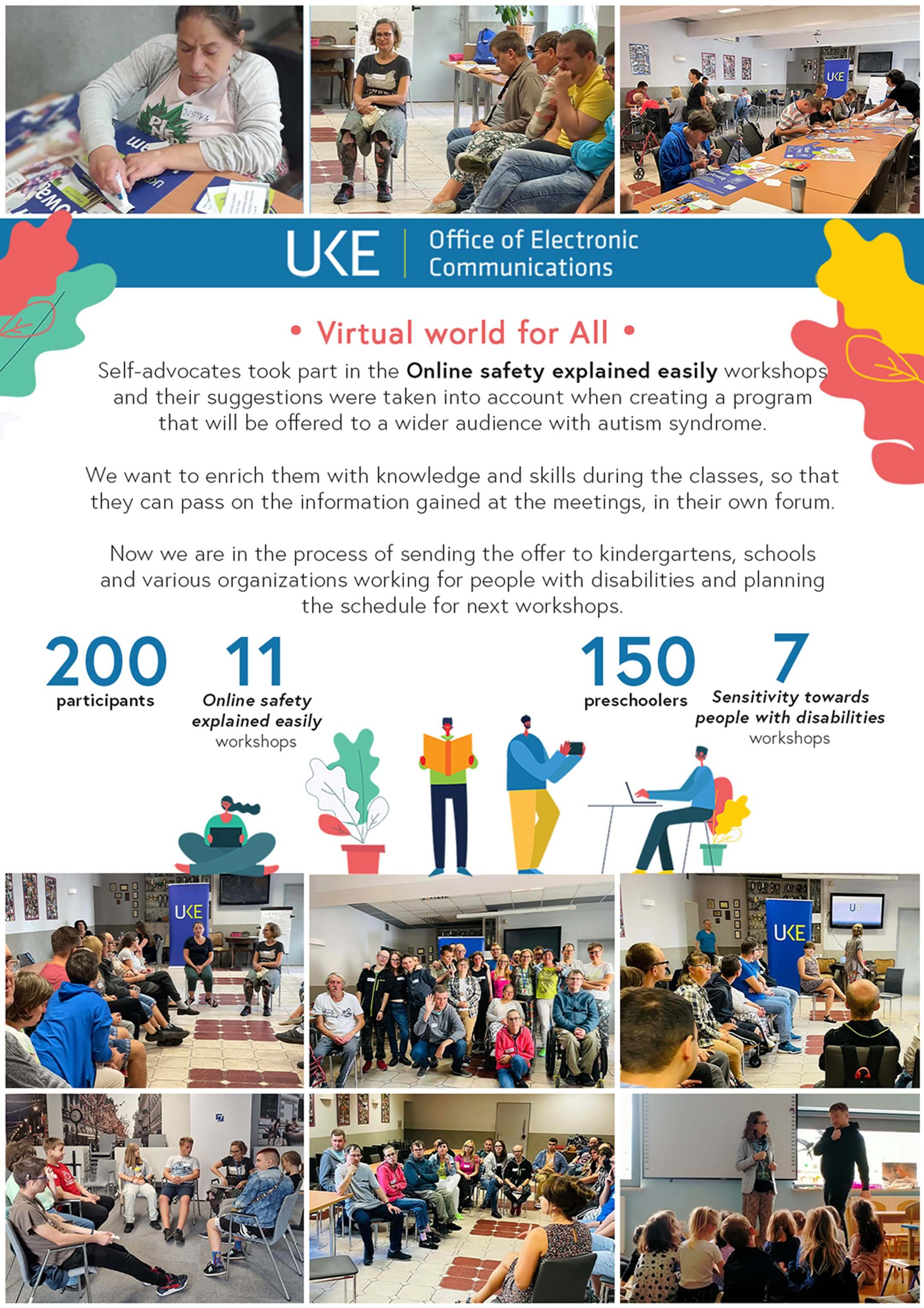 The project consists of two types of activities:a) building awareness and sensitivity to the requirements of people with special needs, including those with disabilities, among the youngest (preschool and early elementary school children)b) educational activities concerning online safety, dedicated to people with intellectual disabilities and those with the autism spectrum disordersThe goal of the first activity is to raise awareness among children about the different needs of people with disabilities and savoir-vivre in contact with people with disabilities. During the workshops we show alternative ways of communication (e.g. sign language for the Deaf - Deaf as a linguistic and cultural minority) and the use of various supporting technologies (video interpreter; screen readers ; induction loop). The workshops are attended by a person with a disability, so participants can ask questions: how a person performs an activity, if and how a deaf person uses the phone. The children break down their barriers to interact with people with disabilities.The aim of the second activity is to increase online safety for children and young people with special needs, particularly those with the autism spectrum disorders and with intellectual disabilities. Like their peers, they spend time online, have social media accounts where they post photos, play games, and make friends. Both of these groups of people, like all other users, might become target to cyber-bullying. Unfortunately, they are often unaware of the dangers, and this is due to the scarcity of educational materials adapted to their cognitive abilities. The classes are scheduled in a series of four stationary meetings. This gives the instructor and participants a chance to get to know each other and build mutual trust, which is very important when working with such groups. In addition, the facilitator can adapt the way the classes are conducted to the individual needs. This is very important for people with intellectual disabilities and neuroatypical people.