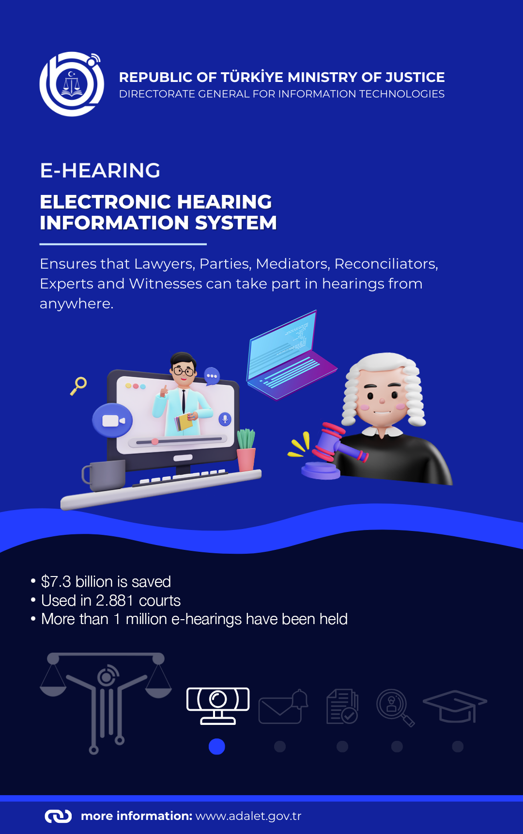 E-Hearing project is developed to ensure the remote-participation in hearings of civil courts by parties, lawyers, experts and other participants through the method of video-conferencing in cases where physical participation is challenging. The project, which is built on an open-source coded structure, is designed to adapt to volatile internet connection speeds. The system, which is supported with cutting-edge technological solutions such as video streaming in 720p HD resolution and VP9 SVC video codec, is built on a container architecture and is horizontally scalable, which means that when needed the capacity of the system can be easily increased. The project expedited the court processes by ensuring participatin in the court hearings in an electronic environment, saved expenses of transportation and accommodation, decreased traffic density in metropolitan cities making a contribution to the ecosystem of the city and ensuring that the court processes are not hampered during the pandemic. The project, which started with 5 pilot courts, is now used actively in 2,881 courts and more than 1 million hearings have been carried out in the electronic environment and it saved approximately $7.3 billion USD to the benefit of the public. The e-Hearing Project was awarded with the IT Service Award in the 40th National IT Congress which was held by the IT Association of Türkiye.