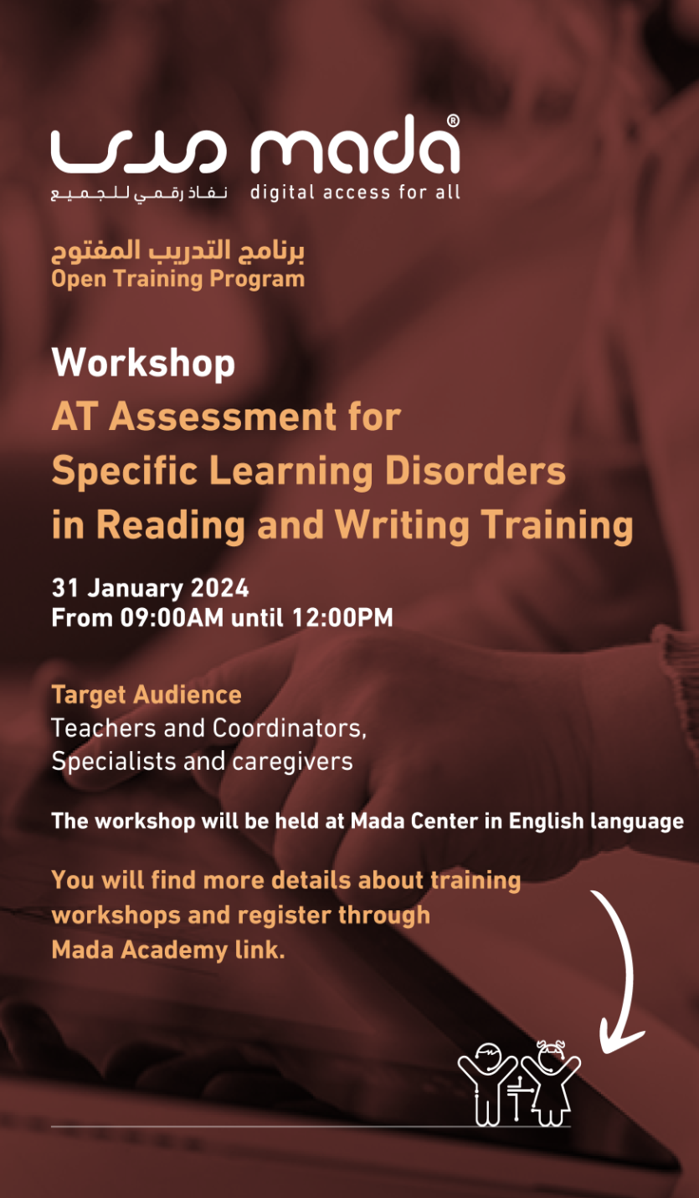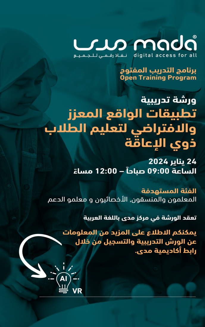 Mada Center delivers training and capacity-building services via Mada Academy.Mada Academy is an initiative recently launched by Mada Center toward empowering people and institutions, through providing engaging and inspiring inclusive training and capacity development for all, as well as supporting open and inclusive digital education IDE services, in compliance with the national and UN framework, in particular the CRPD article 9 about accessibility and article 24 about education, as well as the SDG 4 about quality education for all.Mada Academy serves as a center of excellence in training, professional development, and lifelong learning for all, including learners with disabilities. The academy works to promote open and inclusive digital education opportunities, and provides quality accessible online and blended training courses, as well as face-to-face training workshops, in a wide range of cutting-Edge topics, with a focus on information and communication technologies (ICTs) accessibility, assistive technology, and inclusive education.