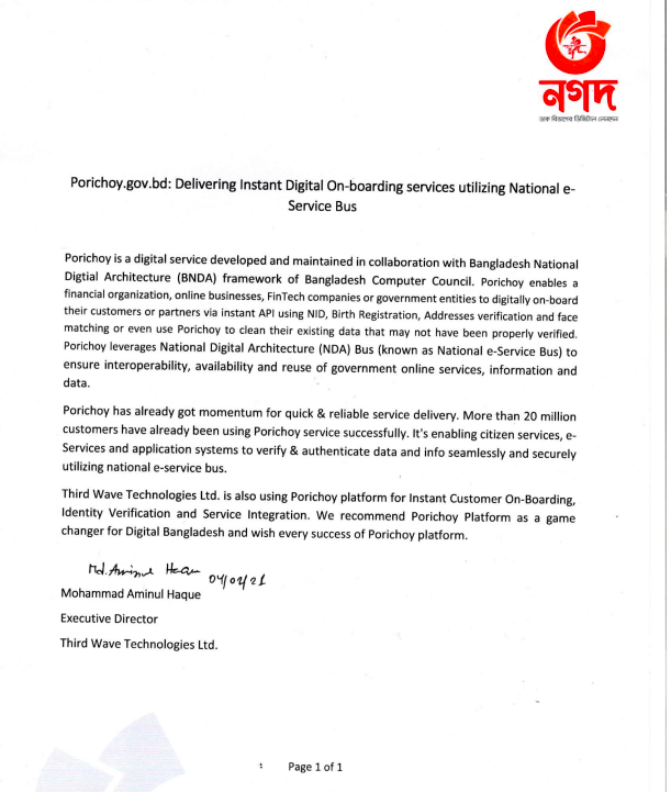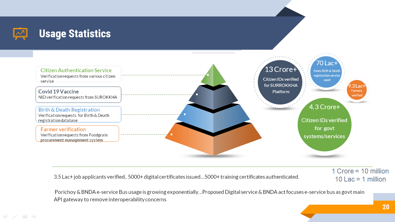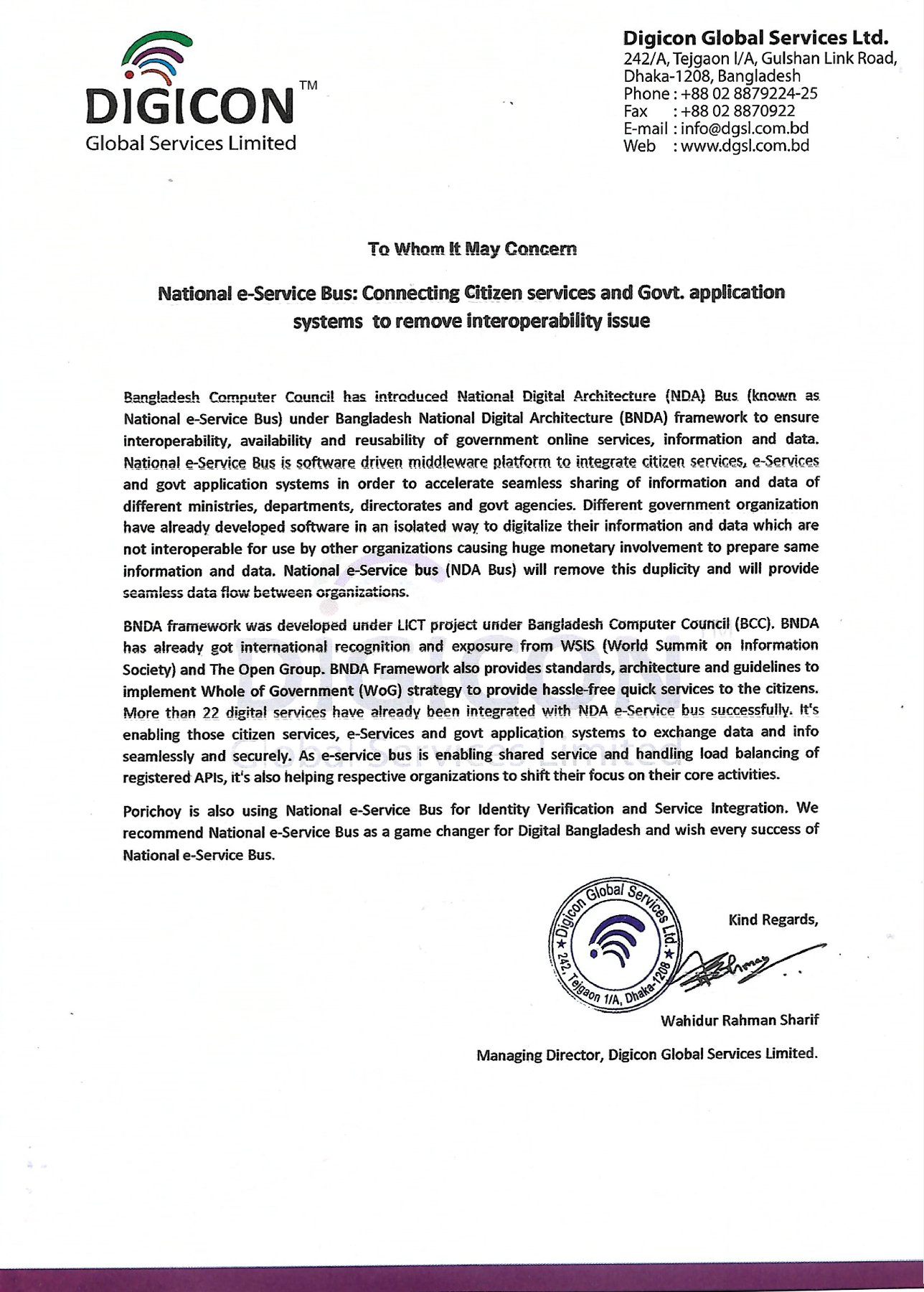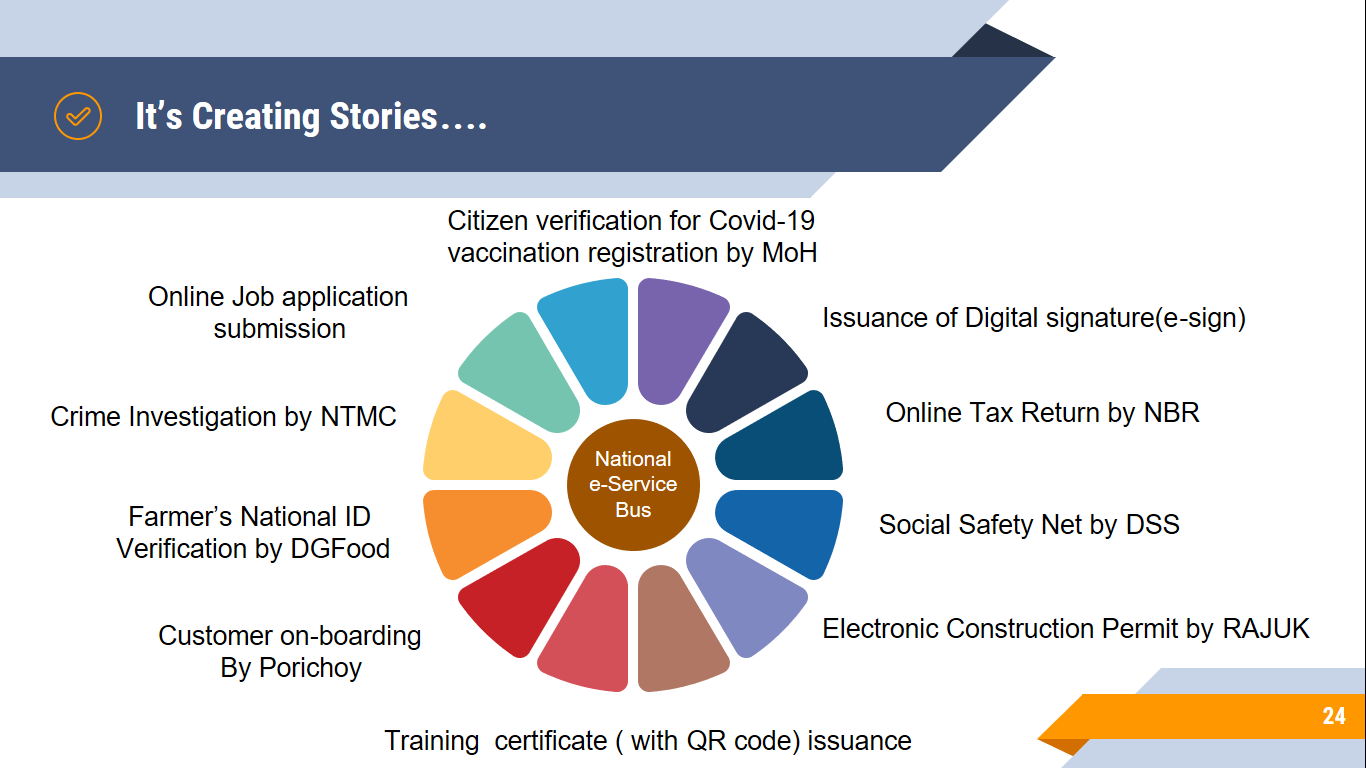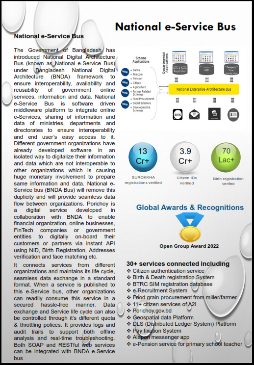National e-service bus is creating stories for organizations. It’s enabling govt organizations to deliver services for citizens in shorter time. It’s helping non-Govt organizations to keep momentum in their business by minimizing customer acquisition time. It has created precedence of utilizing ICT applications in identity management sector.