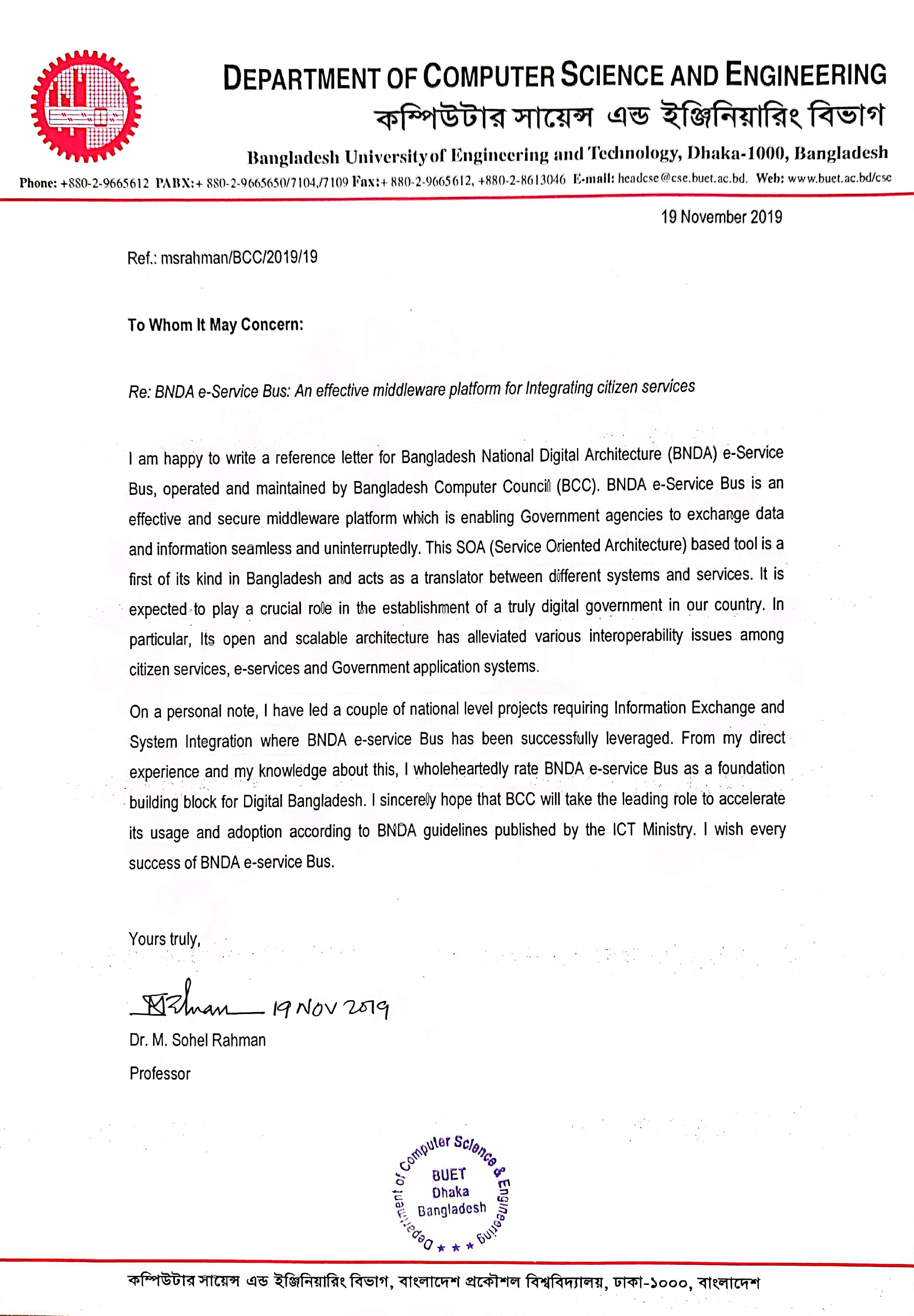 If a concept or project has been proven to work in one community or region, it can often be exported to other communities or regions in the same country or abroad. While there are, of course, vast differences between countries and even between different parts of the same country, a good project will often be capable of being replicated elsewhere. We strongly believe that the National e-Service bus can be replicated in other departments/countries. As different country/organization have different policies but this system can be replicated with some modification. ICT Ministry, in collaboration with Prime Minister’s office, has taken initiative to introduce sectorial service bus for other ministries and divisions of the country. We followed BNDA (Bangladesh National Digital Architecture) framework in developing and maintenance of this platform. BNDA framework, which is developed in adherence to the TOGAF standard, promotes development and implementation of shared services. BCC and ICT Ministry has planned to include passport, tax payer database, driving license etc with National e-service bus in upcoming days. Many countries have been implementing TOGAF standard. And TOGAF emphasizes the principles of Service-Oriented Architecture (SOA). Since the initiative is primarily a middleware platform, it can be easily replicated to other countries also. So it may need some minor modification or customization for other countries. BCC is always ready to take the responsibility of tweaking the system for replicating other countries.