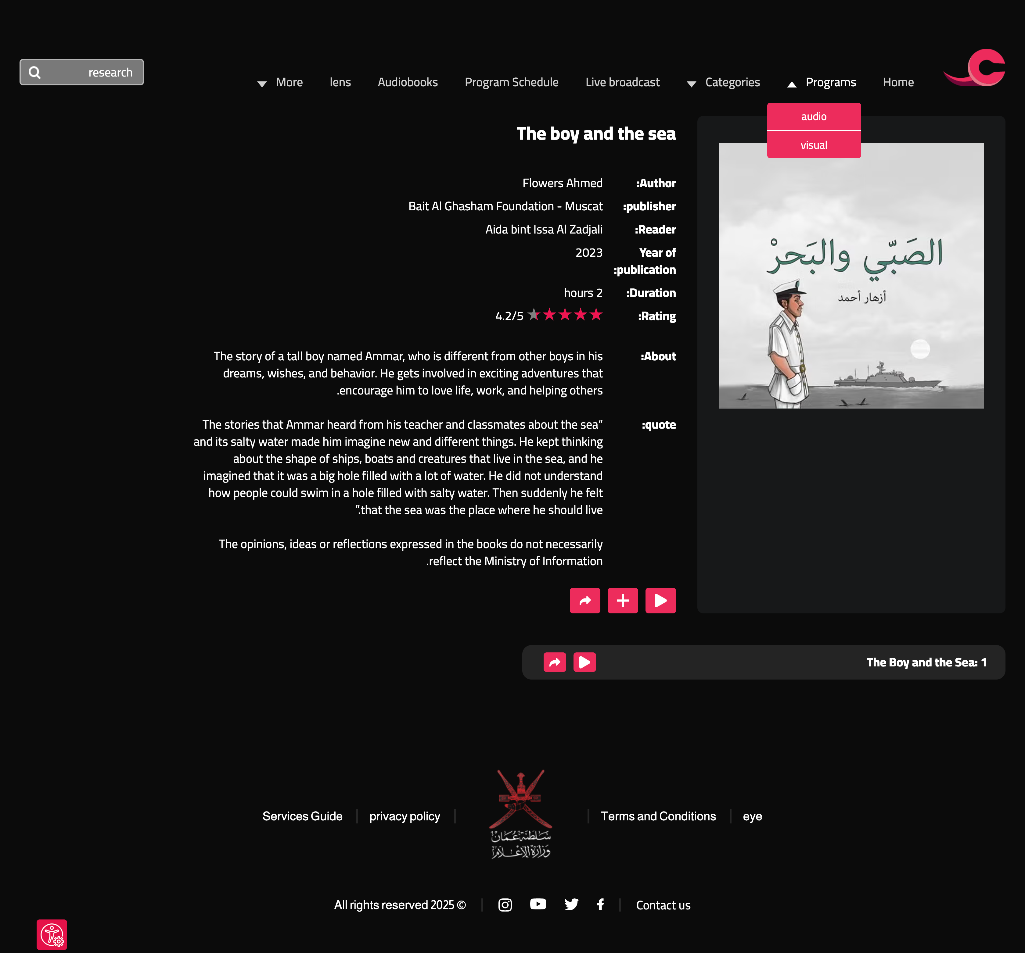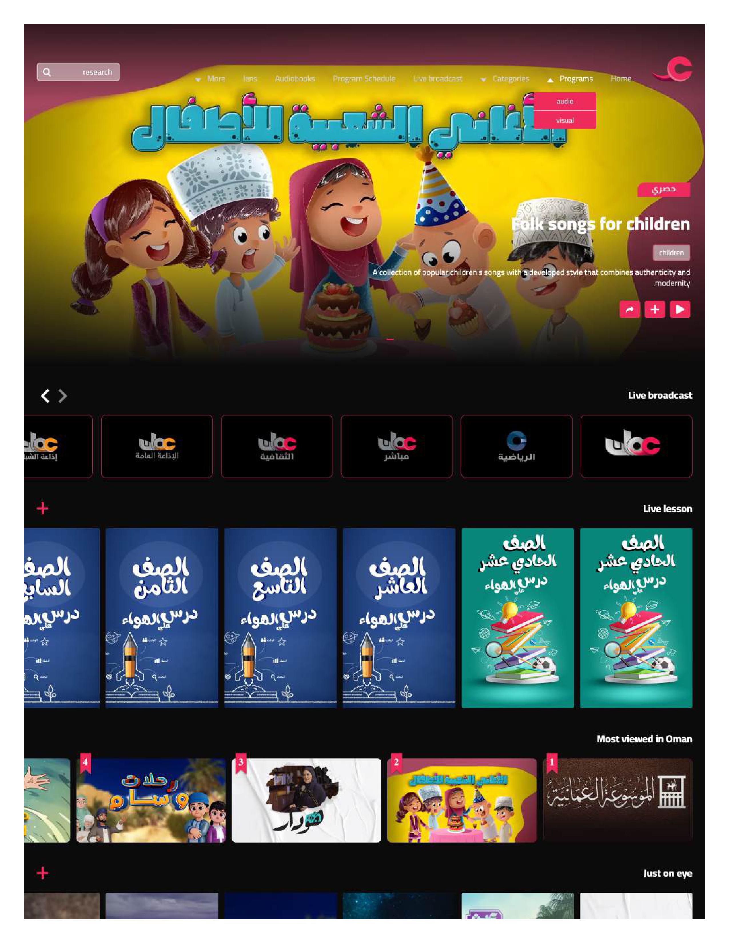 Ayn VOD is a pioneering initiative by the Ministry of Information to elevate Omani and Arabic digital media on the global stage. The platform aims to:- Enhance the presence of Omani and Arabic media by adopting cutting-edge digital practices.- Promote and preserve Omani and Arabic cultural identity through high-quality, authentic content shared globally.- Invest in Omani and Arab youth by empowering content creators, hosting their works, and fostering collaboration.-Uphold the highest professional and ethical standards in digital content creation.-Bridge the Ministry of Information with diverse audiences by offering tailored content: archival material for diverse age groups, exclusive programs for youth, and interactive content for children.-Support creative industries and elevate the quality of Arabic digital content production.Results Achieved:Ayn VOD has achieved remarkable milestones, with over 14 million viewers from more than 190 countries, showcasing its global impact. The platform features a rich library of over 60,000 diverse content pieces, including 55+ professionally curated audiobooks across various genres. Furthermore, Ayn platform was honored with the ESCWA Award for Arab Digital Content for Sustainable Development 2024 by the United Nations and received the Golden Award at the Gulf Festival for the best digital content, cementing its reputation as a leader in delivering exceptional and impactful digital experiences.Impact:Ayn VOD has become a beacon of Omani and Arabic cultural diplomacy, promoting heritage and creativity worldwide. It has empowered a new generation of Omani and Arab content creators, offering them a platform to showcase their talent and reach global audiences. By connecting millions and fostering a deeper appreciation for Omani culture, Ayn VOD exemplifies the transformative role of media in building cultural bridges, inspiring pride, and driving innovation.
