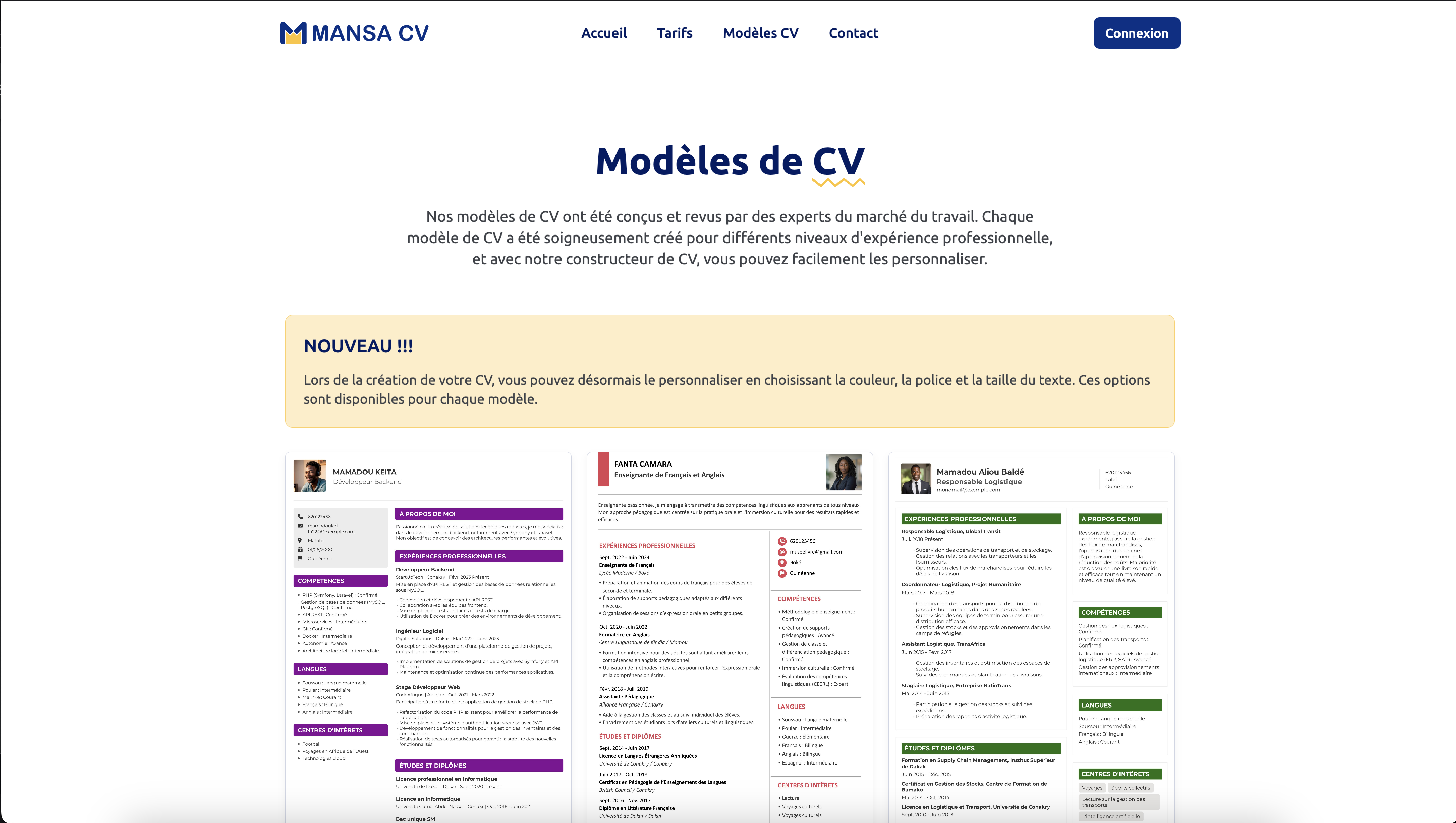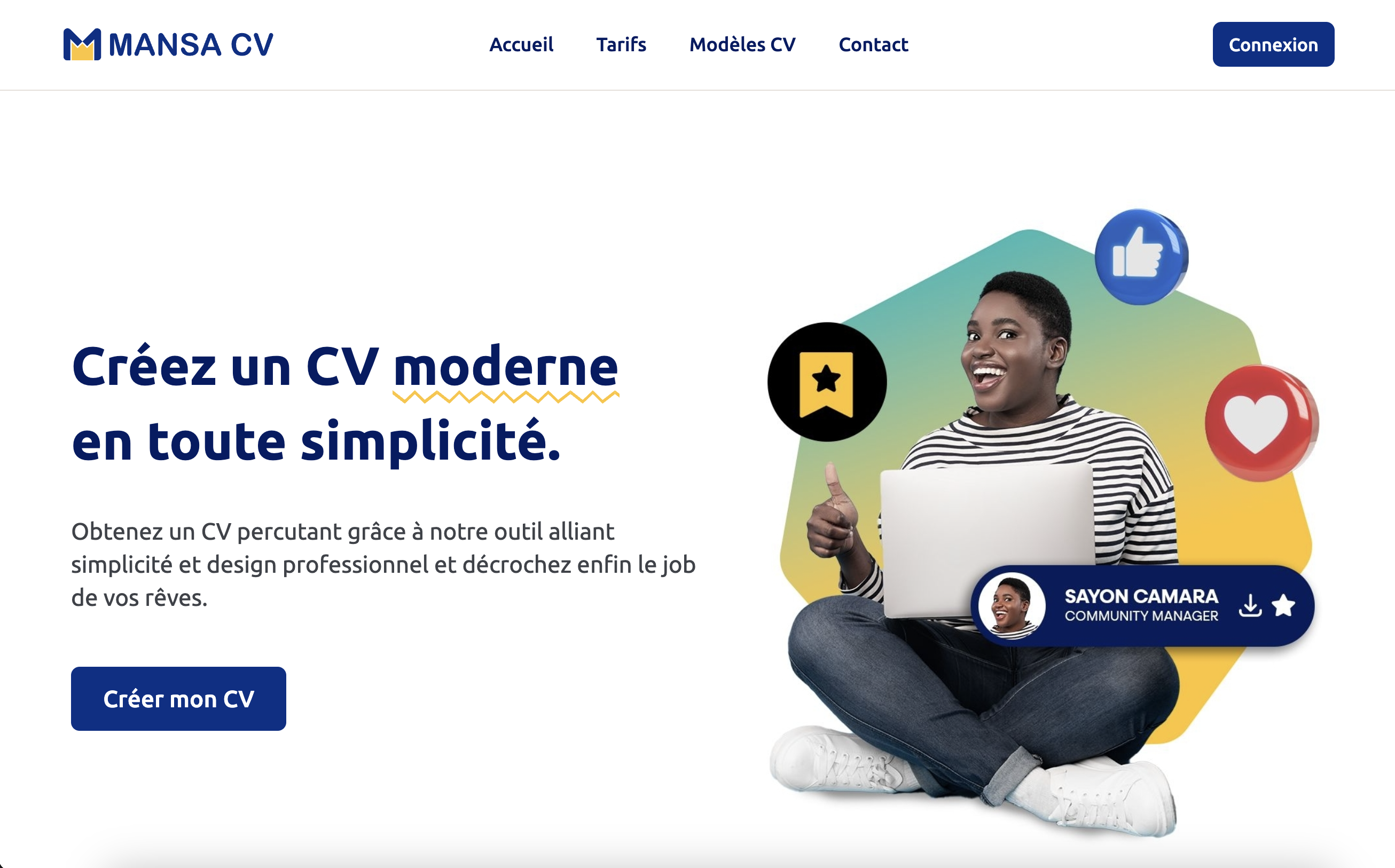 Mansa CV is a digital platform designed to help young Guineans access job opportunities more easily. Every year, 200,000 young people enter the job market in Guinea, but many struggle to find employment due to limited visibility and lack of proper tools.Using artificial intelligence and digital technologies, Mansa CV allows users to create professional CVs, optimize them for recruiters, access tailored job offers, and obtain skills certifications to improve employability. The platform also provides career guidance and support through an interactive and educational system.In just 4 months, Mansa CV has had a major impact:📌 500,000 visits📌 10,000 registered users📌 11,000 CVs created and downloadedMansa CV aligns with Sustainable Development Goals (SDGs) by enhancing education (SDG 4), promoting decent work (SDG 8), driving digital innovation (SDG 9), and reducing job market inequalities (SDG 10).More than a job board, Mansa CV is a career accelerator, giving every young Guinean a fair chance to access employment opportunities through cutting-edge technology.