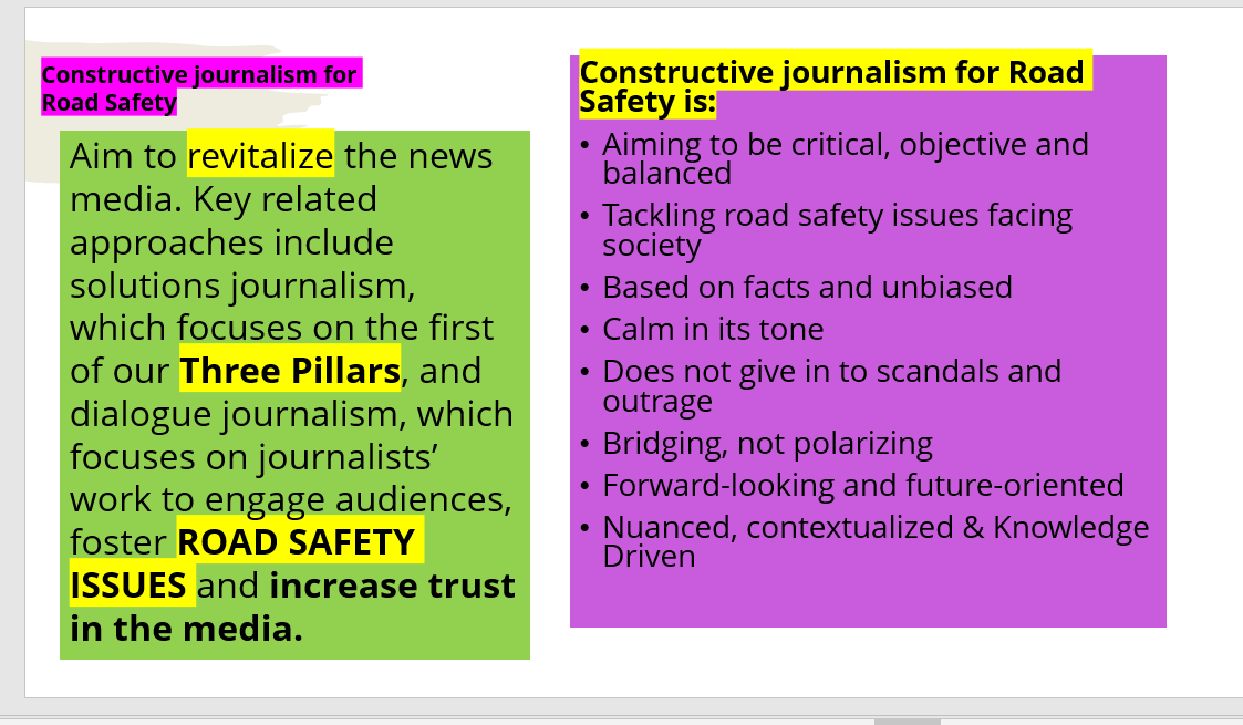 Promoting the values of the World Summit on the Information Society (WSIS) through your "Constructive Journalism for Road Safety" project is an excellent way to align media professionals' practices with global priorities. Here's how you can emphasize WSIS values through this initiative: Inclusivity and Accessibility: this project ensures that information on road safety is accessible to all communities, particularly vulnerable groups. This can include creating content that is inclusive of people with disabilities and using digital platforms to reach rural or marginalized populations. Social Media for Advocacy: Utilize social media platforms to amplify road safety campaigns, reach younger audiences, and spark digital discussions. It’s a space to promote responsible behaviors and share constructive reporting that resonates with a wider audience. Interactive and Data-Driven Content: Digital platforms host interactive content like infographics, videos, and road safety simulations. This can make complex road safety data more understandable and actionable, fostering informed decision-making. Mobile Accessibility: Since many people rely on mobile phones, making road safety content mobile-friendly will ensure that information is easily accessible to a broad audience. Partnerships with Governments and NGOs: Collaborate with governmental bodies, NGOs, and international organizations working on road safety. This allows media professionals to access credible information and to align their reporting with international standards, fostering a broader impact. By integrating these strategies, you can effectively promote WSIS values while advancing road safety awareness and behavior through constructive journalism. Let me know if you'd like more ideas on enhancing the project or specific aspects to focus on!