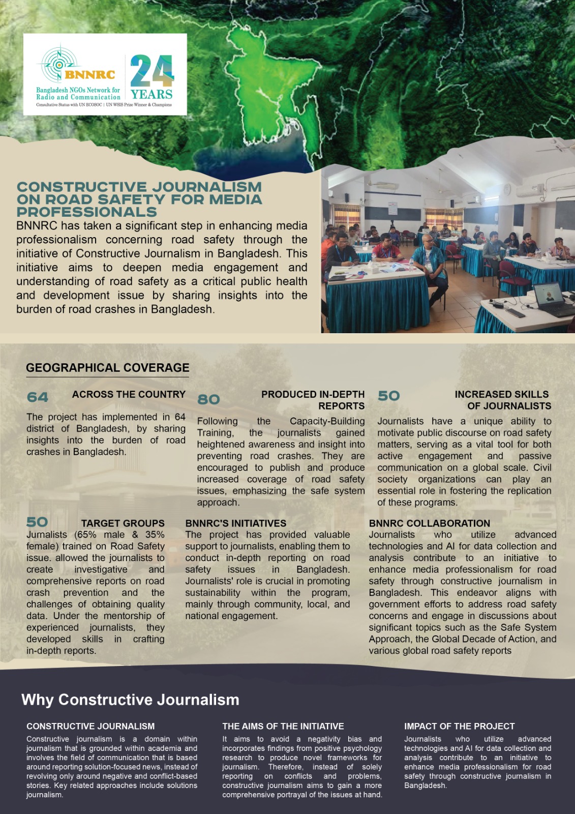 Bangladesh NGOs Network for Radio and Communication has taken a significant step in enhancing media professionalism concerning road safety through the initiative of Constructive Journalism in Bangladesh. This initiative aims to deepen media engagement and understanding of road safety as a critical public health and development issue. By sharing insights into the burden of road crashes in Bangladesh, this effort highlights challenges while encouraging journalists to focus on a safe system approach. Additionally, it emphasizes the importance of educating journalists about road safety prevention strategies. Prominent journalists have been chosen for training and specialized road safety journalism fellowships.According to the WHO's 'Global Status Report on Road Safety 2023', road crashes remain the leading cause of death among individuals aged 5 to 29 globally. The issue continues to result in a significant and growing number of fatalities and severe injuries, particularly in developing nations. In contrast, developed countries have witnessed a steady decline in road fatalities attributed to concerted efforts, effective coordination, community involvement, well-researched road safety innovations, best practices, and strategic resource allocation.