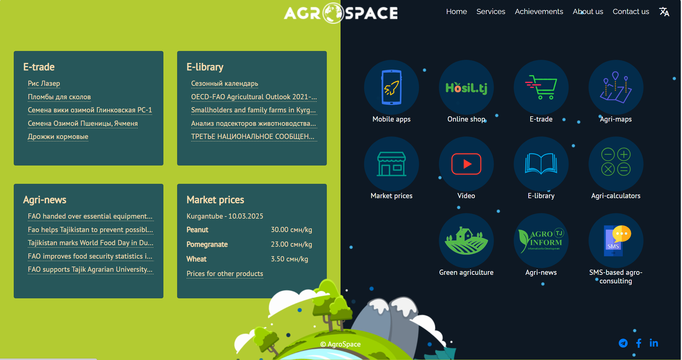 "The purpose of the Platform: Small agricultural producers and specialists have free access to verified information for business development, sectors and regions. The Interface of the Platform has four languages: English, Kyrgyz, Russian and Tajik languages. Results achieved: Operating Platform for more than 7 years; 19 operating mobile applications with English, Kyrgyz, Russian and Tajik languages, https://apps.agroinform.asia/en/index.html , https://play.google.com/store/apps/developer?id=Agroinform.TJ&hl=en ; Electronic library , https://kitob.agroinform.asia/en and YouTube channel (6 240 subscribers) with regional electronic and video materials, https://www.youtube.com/agroinformtj ; E-Trade board for purchase and sale of agricultural products and services, http://trade.agroinform.asia/ and retail market prices for agricultural products, https://prices.agroinform.asia/en; Electronic agricultural maps awarded by EEC, ITU-FAO, FAO, https://maps.agroinform.asia/cultivated-area/krg/en?crop=10&year=2020 ; Distant consulting system linking business to consultant and training services via video communication on payable base. More than a million users from different countries. Impact on users: Access to expert-verified information; Possibility of direct communication with specialists; Reduction of production and market risks; Effective planning of business, sector and region development."