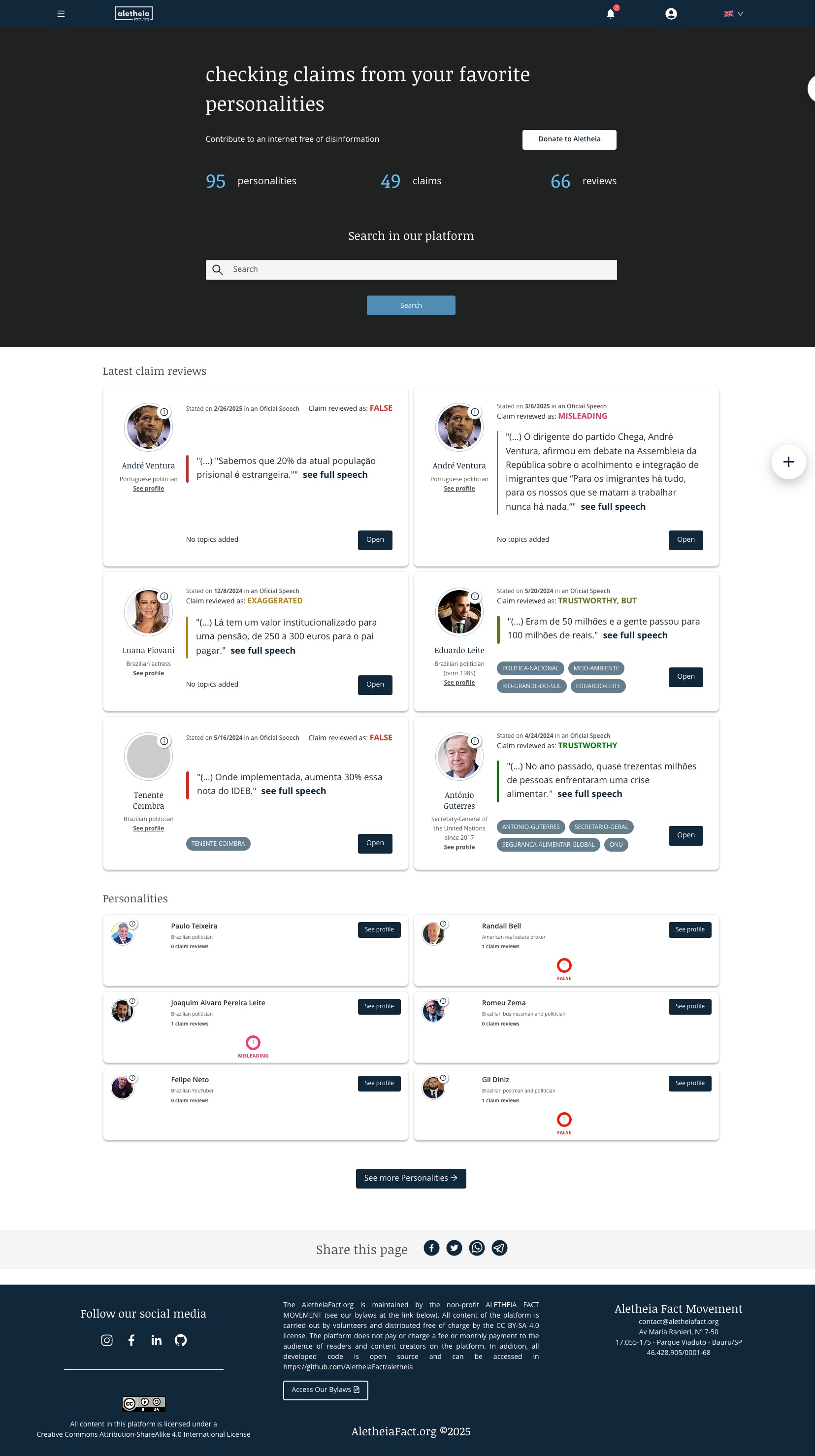 AletheiaFact.org is an online platform dedicated to empowering communities in Brazil with accurate, verified information. The platform’s main objective is to combat the spread of misinformation by harnessing collaborative fact-checking tools and educational resources that encourage digital literacy. Through AletheiaFact.org, users and partner organizations can submit claims for verification, collaborate on investigations, and publish well-documented analyses that are openly accessible.Among its key milestones, AletheiaFact.org introduced an Instagram Virtual Assistant (“Verifica Pra Mim + Aletheia”) for crowdsourced reporting of dubious claims, joined the Supreme Federal Court’s (STF) Program to Combat Disinformation, and forged an international collaboration with the University of Beira Interior (UBI) and news outlets in Portugal. The project also partnered with the Alumia Laboratory in João Pessoa/PB to advance research on disinformation and media literacy, and established an academic training program in Rio Grande do Sul and São Paulo (involving UFSM-FW, UFRGS, Unipampa, and PUCRS). AletheiaFact.org has actively participated in international fact-checking events, promoting dialogue and knowledge exchange. By bridging research, education, and hands-on verification, AletheiaFact.org continues to strengthen global efforts against disinformation and foster a well-informed society.Looking ahead, the platform is focused on establishing a robust cultural, social, and technical infrastructure to democratize fact-checking and defend democracy nationwide. This includes forming a national committee set to begin work in the second quarter of 2025, in partnership with academic institutions across the country.