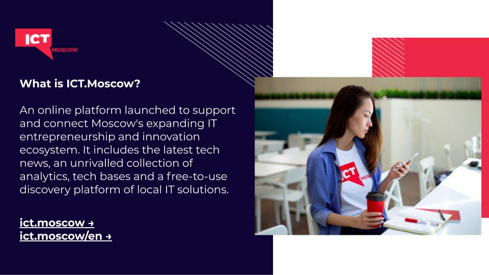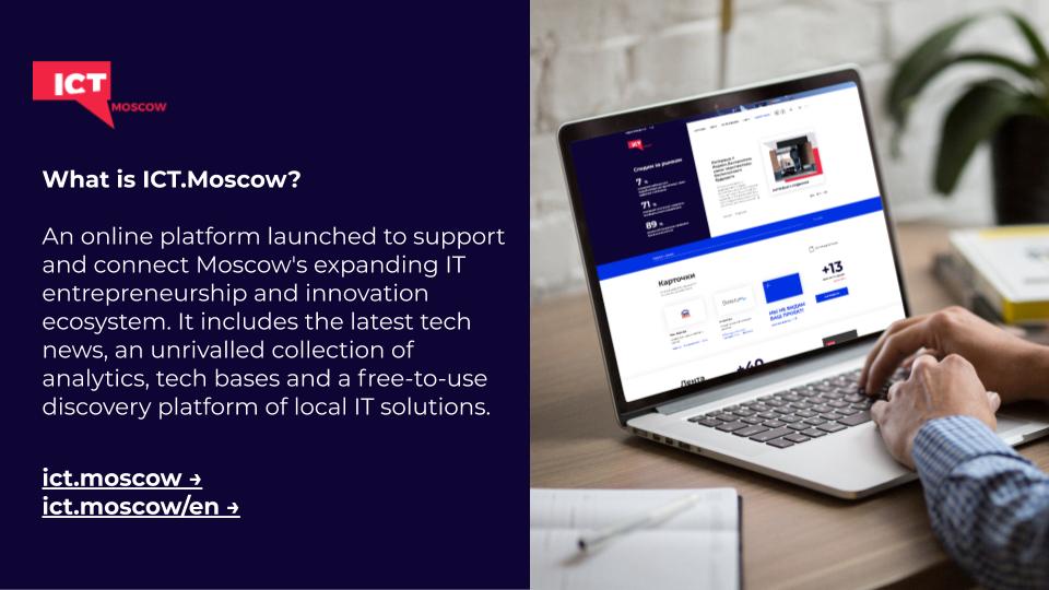 ICT.Moscow (https://ict.moscow/) is an open platform about digital technologies in Moscow.The platform is the base for building a fuller picture of the technology market development in the city and outside it. It is a convenient information, service and communication hub for professionals working in IT.The platform launches various information campaigns and special projects, sends technology digests, conducts polls and regularly publishes exclusive editorial materials (reviews, selections of expert opinions, news, interviews, etc.) to attract attention to advanced technologies,.ICT.Moscow provides access to industry information and to the catalogue of technological solutions: there are more than 2500 cards describing them.ICT.Moscow launches new projects for specific purposes regularly: from a service for finding coworkings in Moscow to an interactive showcase of the best smart practices. Moreover, knowledge bases of case studies in various IT technologies such as artificial intelligence, COVID-Tech, 5G, blockchain, VR/AR are available on the platform.Users can access the catalogue of more than 1,500 investigations and presentations about technology and digital services consumption in Russia and worldwide.The project facilitates efficient spending of the city budget by:- Uniting the industry on one platform- Forming involved ICT-Community- Market scanning and cataloguing technological solutions- Collecting independent expert opinions