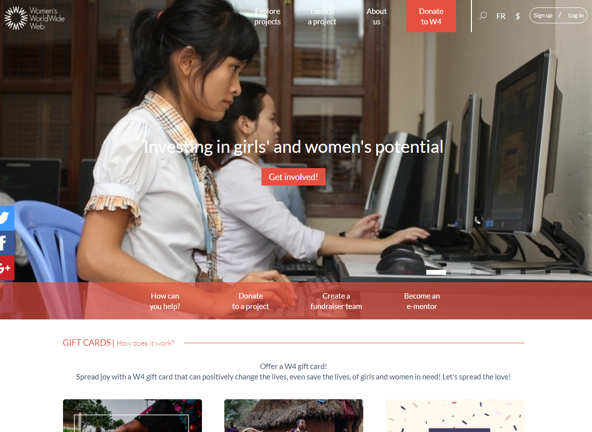 Women’s WorldWide Web (W4) is an online crowdfunding platform aiming to promote girls’ and women’s empowerment worldwide, in cities and in rural areas, in both developing and developed countries. Harnessing the power of digital connection, W4 works to protect girls’ and women’s human rights and to promote their empowerment. Collaboratively, we work to ensure that girls and women everywhere have access to education, healthcare, economic opportunities, the exercise of their rights, and political participation—all of which benefit girls and women.